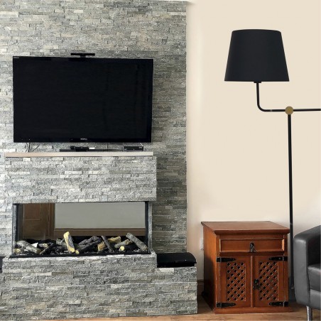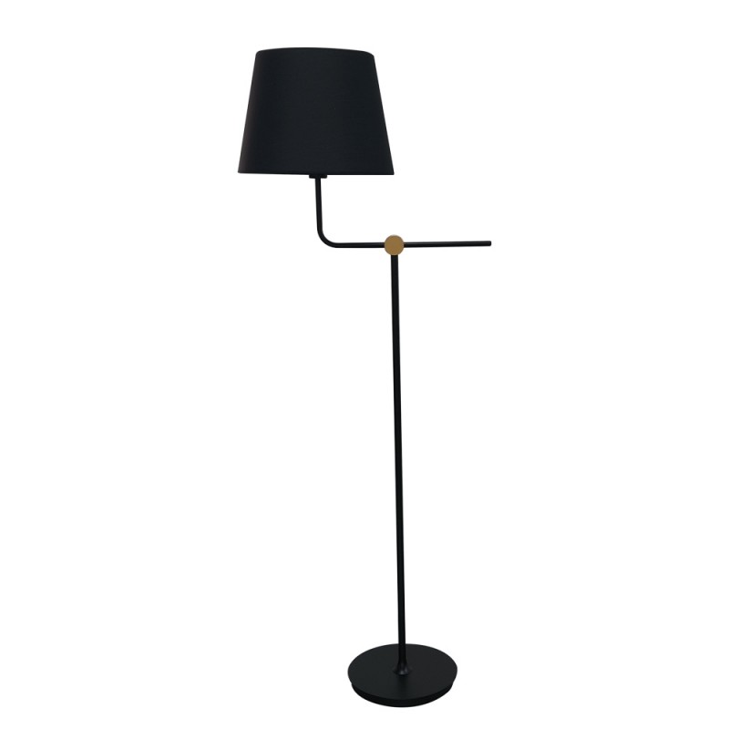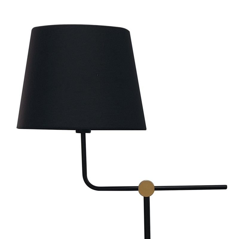 Lampadaire pour salon moderne. Design minimaliste avec structure en métal noir et abat-jour en tissu assorti. Un petit détail doré sur la structure complète le design. Lampadaire de salon à placer à côté du canapé comme lumière d'ambiance.
