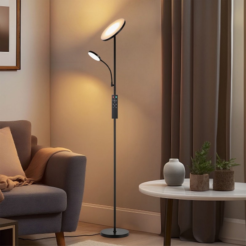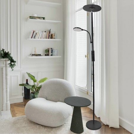 Lampadaire Vinet avec bras de lecture LED. Ce lampadaire très pratique peut être utilisé aussi bien comme éclairage d'ambiance que comme éclairage de lecture ou d'appoint. Vous pouvez régler l'intensité lumineuse et la température de couleur. Télécommande incluse pour sélectionner les différents réglages de la lumière et même programmer l'extinction (1H.). Lampadaire noir avec éclairage LED blanc chaud intégré (30W+6W).