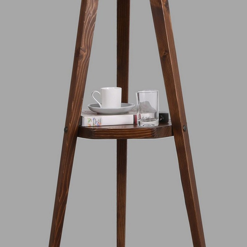 Lampadaire avec trois pieds en bois et une table d'appoint avec une hauteur de 153cm et une base totale de 50cm. L'abat-jour en tissu, disponible en plusieurs couleurs, a un diamètre de 45 cm et une hauteur de 24 cm. La table d'appoint ronde de 26 cm est à une hauteur de 65 cm du sol. Il est éclairé avec une lampe E27 non incluse. Le bouton marche/arrêt de la lampe est situé sur le câble.