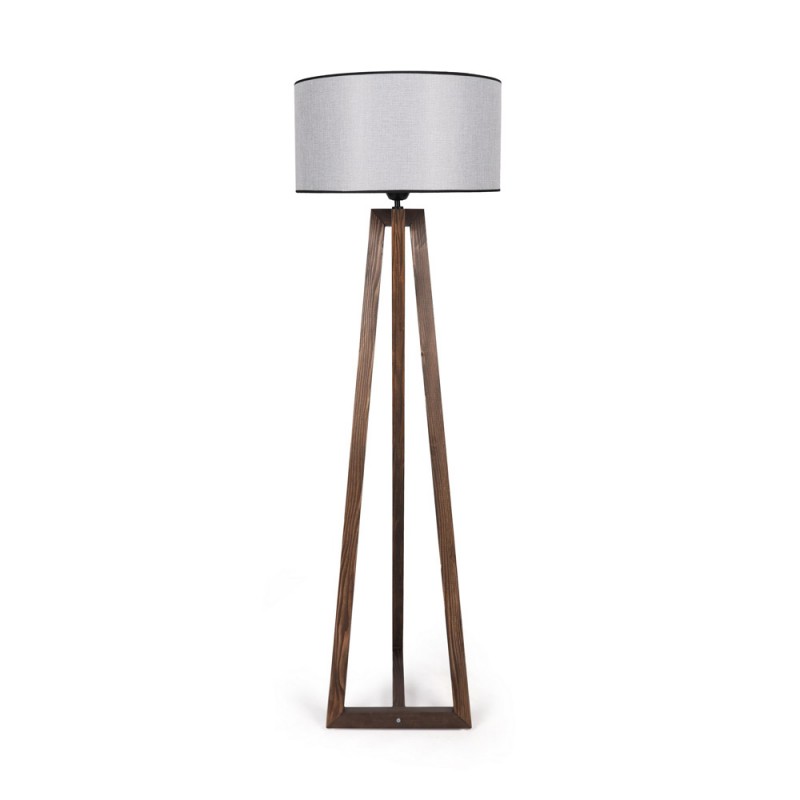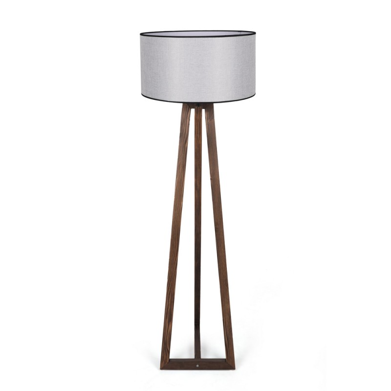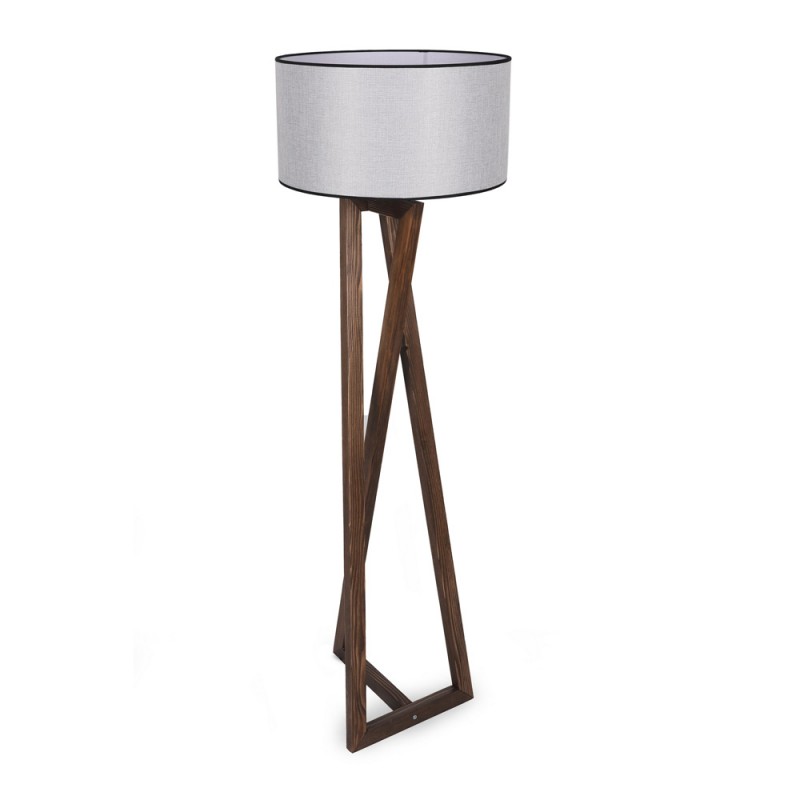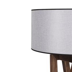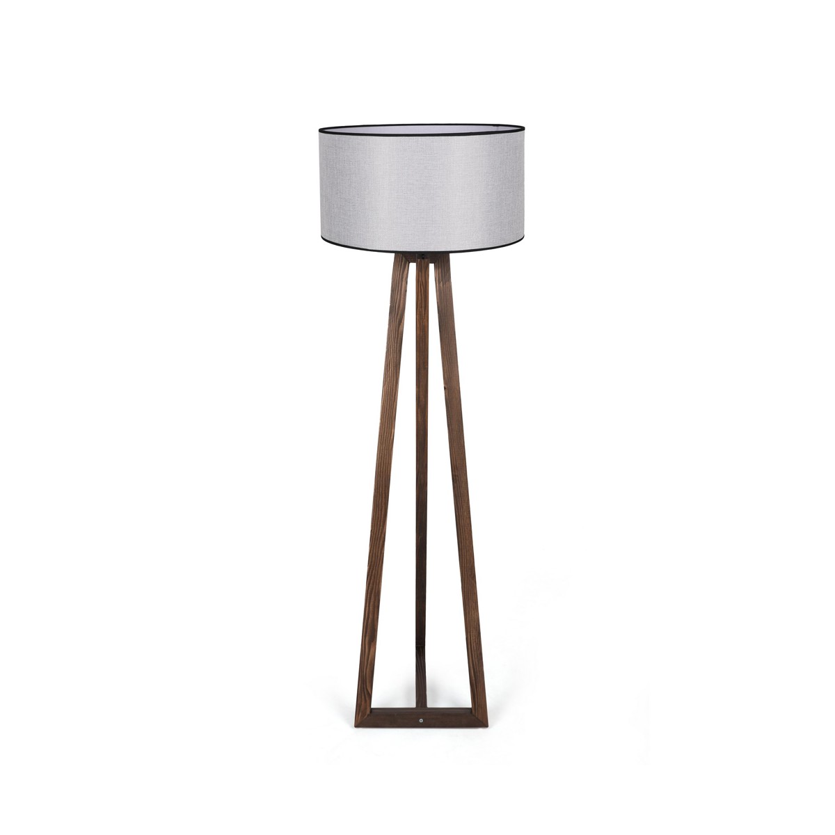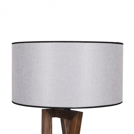 Lampadaire avec trois pieds en bois avec un design géométrique, 166cm de haut et une base de 43cm. L'abat-jour en tissu, disponible en gris clair et gris anthracite, a un diamètre de 45 cm et une hauteur de 24 cm. Il est allumé par une ampoule E27 non incluse. Le bouton marche/arrêt de la lampe est situé sur le câble.