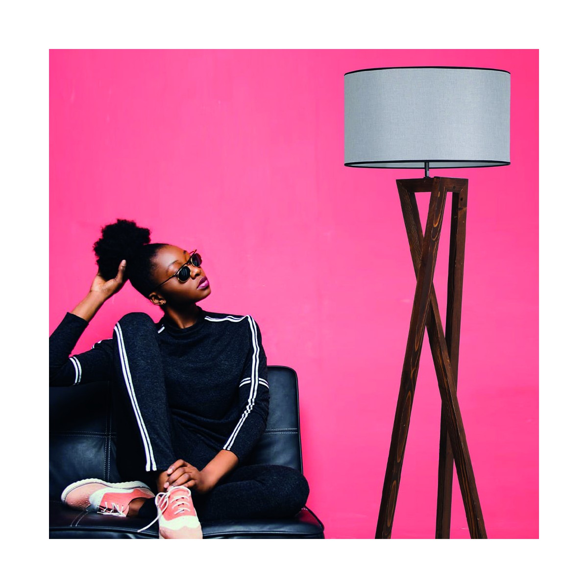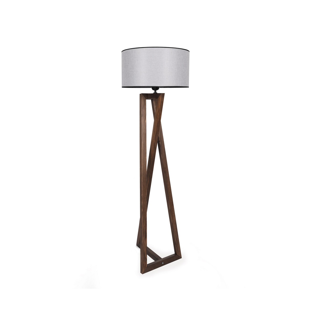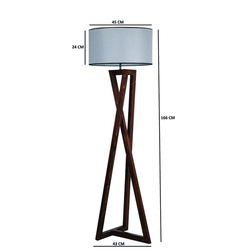 Lampadaire avec trois pieds en bois avec un design géométrique, 166cm de haut et une base de 43cm. L'abat-jour en tissu, disponible en gris clair et gris anthracite, a un diamètre de 45 cm et une hauteur de 24 cm. Il est allumé par une ampoule E27 non incluse. Le bouton marche/arrêt de la lampe est situé sur le câble.
