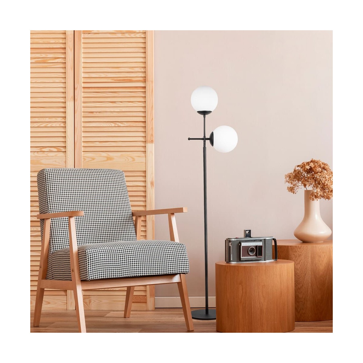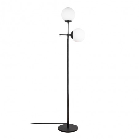 Lampadaire métallique avec finition noir et deux lumières avec abat-jour en verre blanc dépoli. La base ronde de la lampe mesure 34 cm. La hauteur totale est de 174 cm.