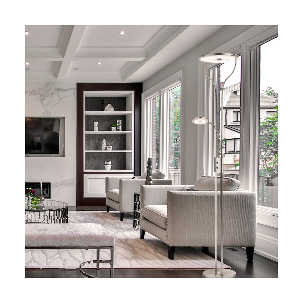 Lampadaire classique en finition nickel, avec lumière principale réglable de 20W et liseuse de 5W. Le câble mesure 180 cm.