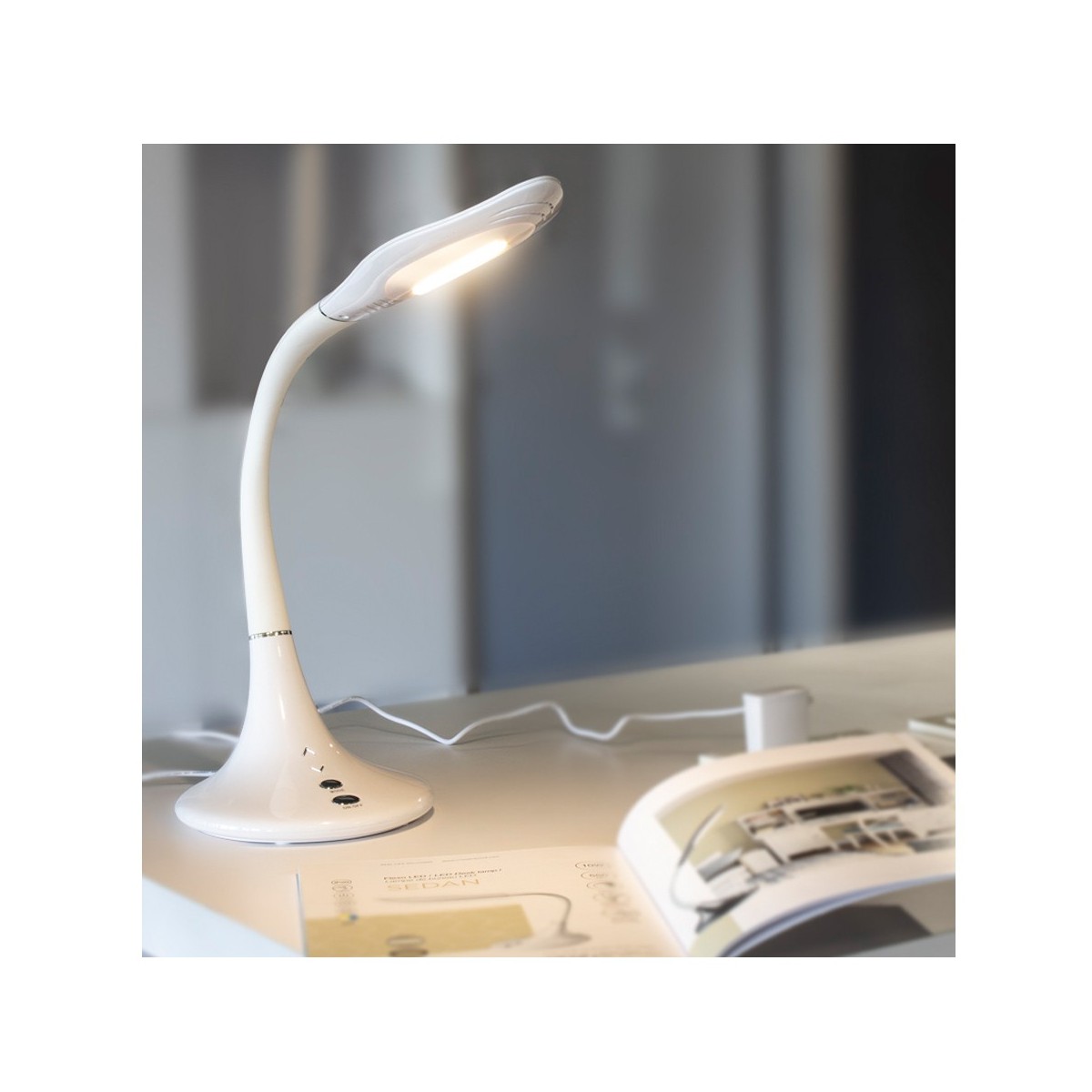 Lampe de bureau avec éclairage Led intégré 10W, 550lm. Graduable avec changement de température (3000K-6000K) grâce à un senseur tactile. Structure flexible de l'ABS.