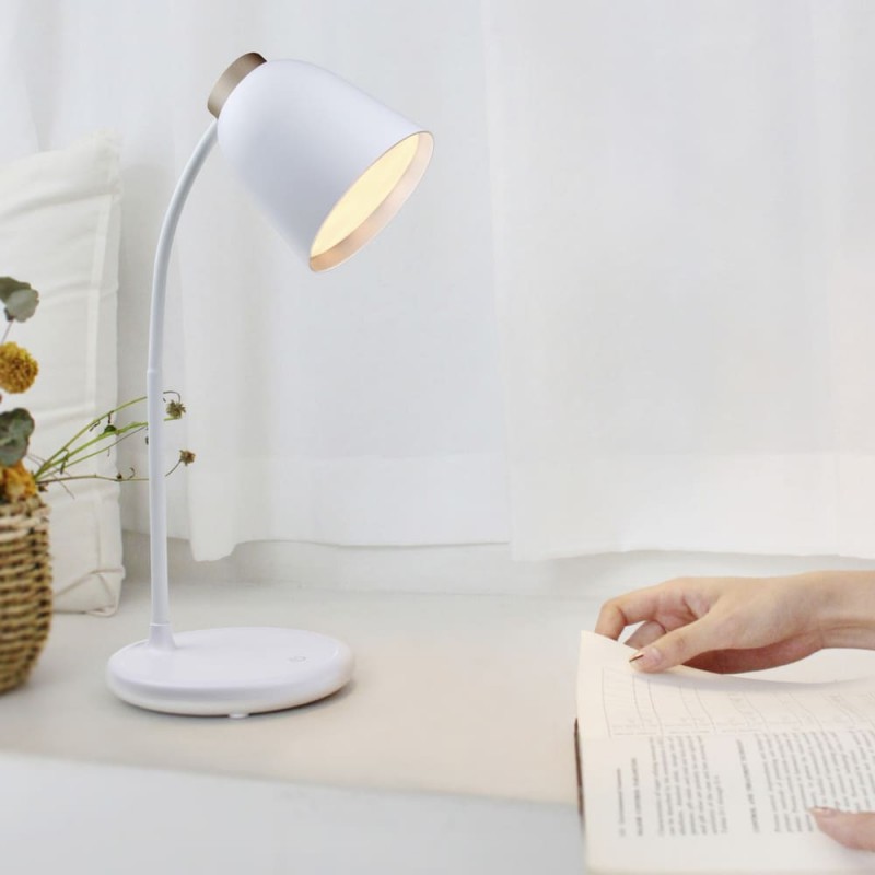 Lampe de bureau avec éclairage LED CCT intégré. Lampe conçue pour être placée sur les bureaux, les tables d'appoint et les tables de chevet en guise d'éclairage. Elle dispose d'une lumière LED intégrée dimmable en intensité et de trois températures de couleur (3000-4000-6000K). Système d'alimentation tactile, port de charge USB-C et batterie rechargeable. Lampe de bureau blanche idéale pour lire, étudier et/ou travailler. Mémoire de mise sous tension.
