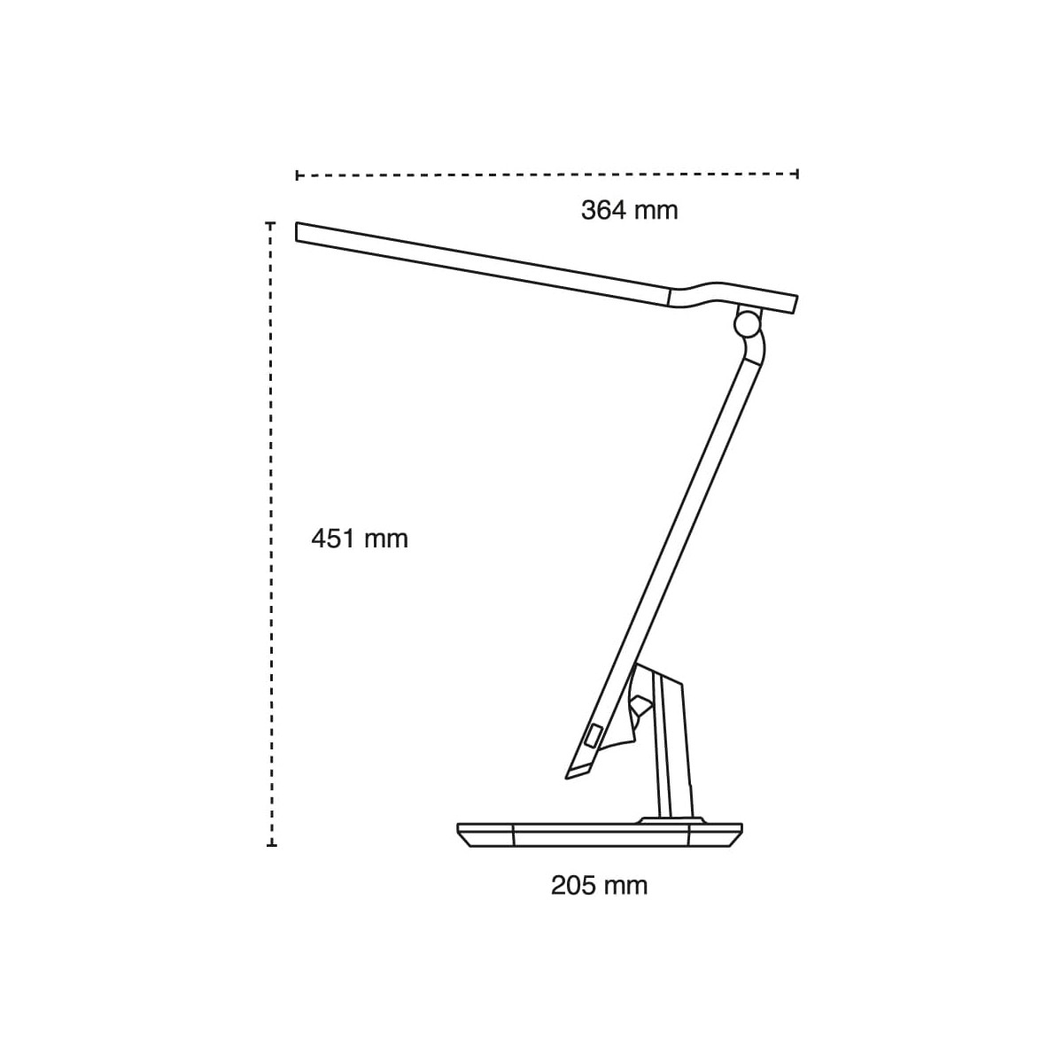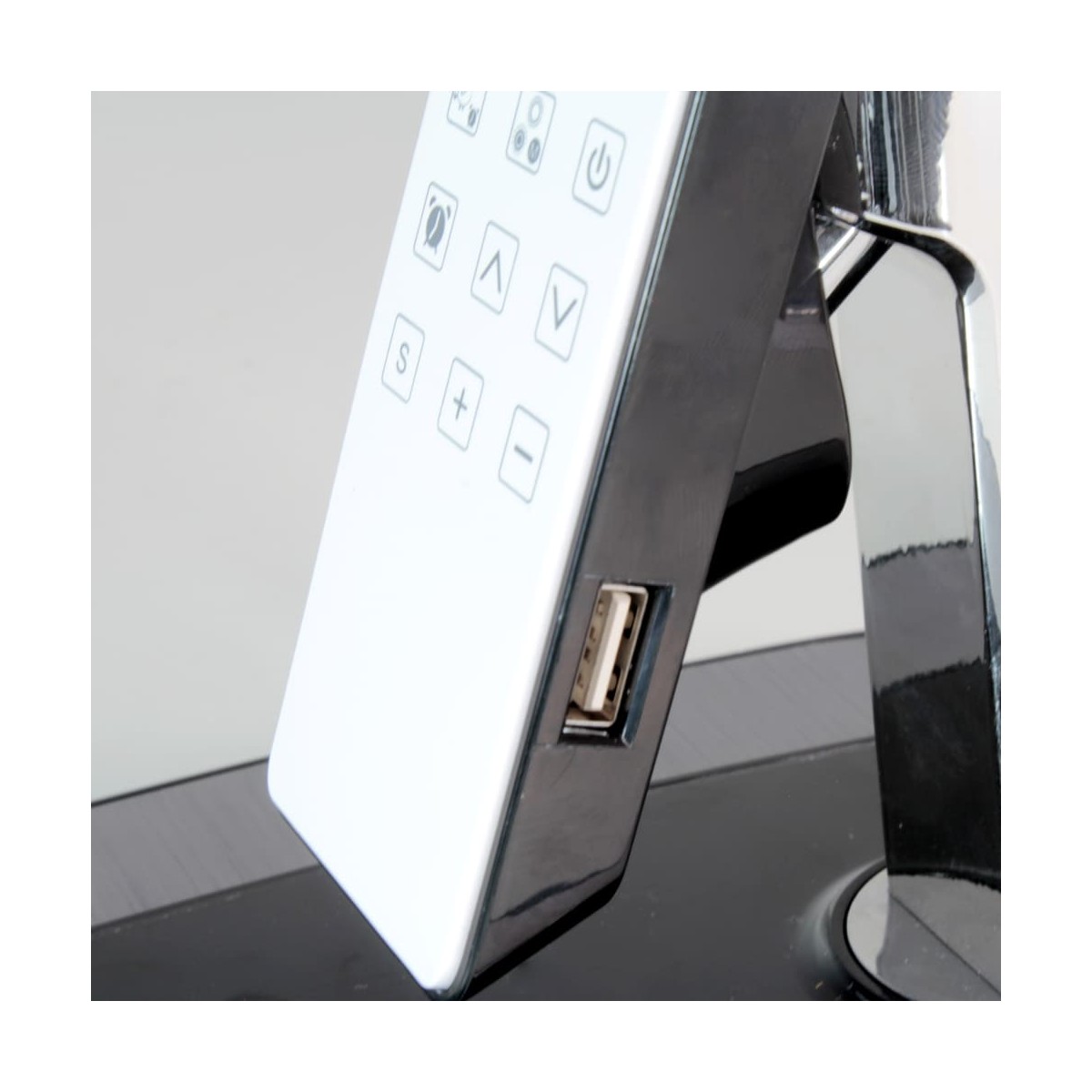 Lampe de bureau LED 10W avec trois tonalités de lumière et 6 intensités lumineuses. Elle permet de régler un réveil et une pré-alarme. Écran LCD numérique avec date et heure et port USB pour charger les appareils électroniques. La pré-alarme peut être réglée 0-2-5-10-15 minutes avant le déclenchement de l'alarme, moment auquel les lumières commenceront à s'allumer progressivement, accompagnées d'un son d'oiseau. La lampe de bureau est dotée d'un corps et d'une tête réglables. Elle est tactile, très facile à utiliser grâce aux boutons situés sous l'écran.