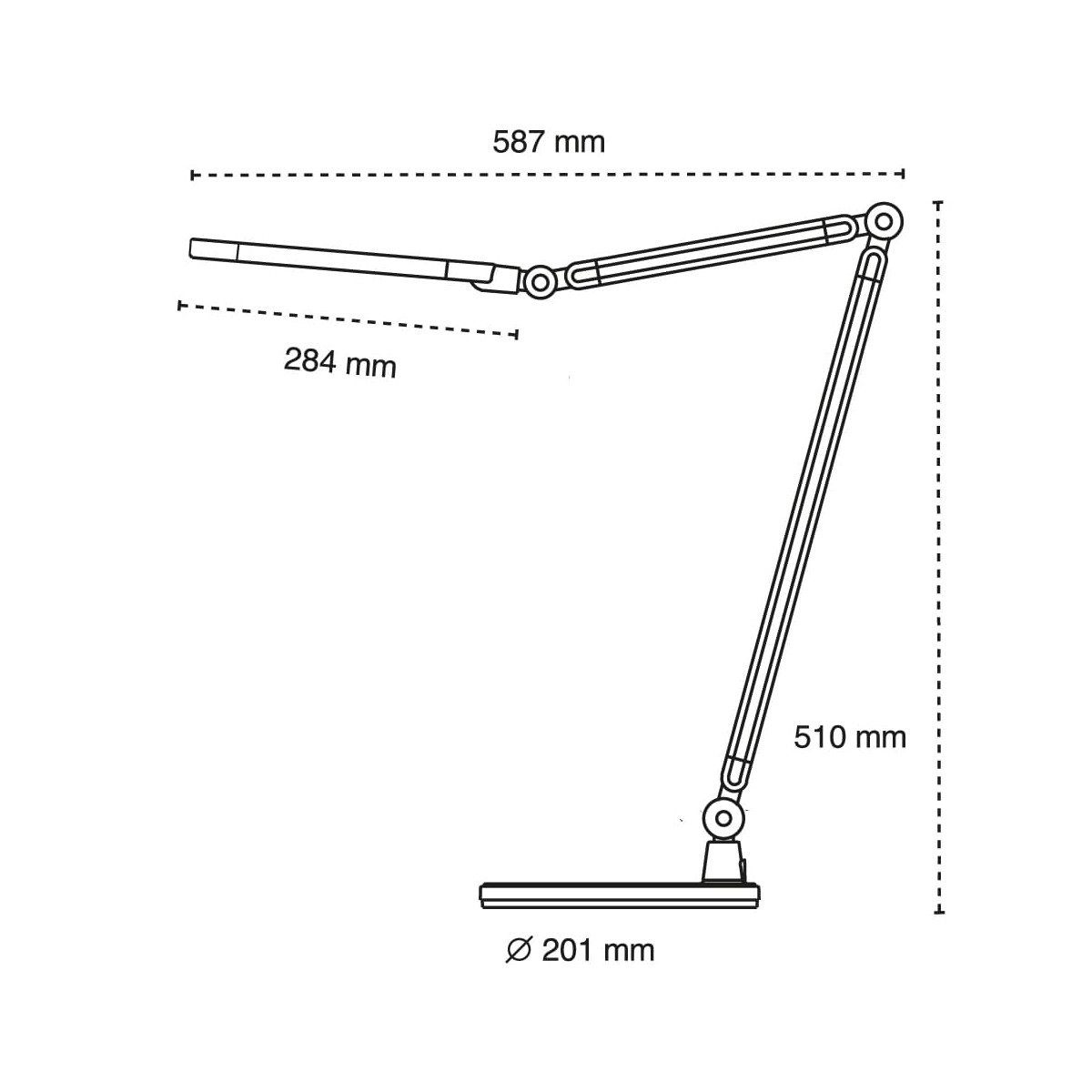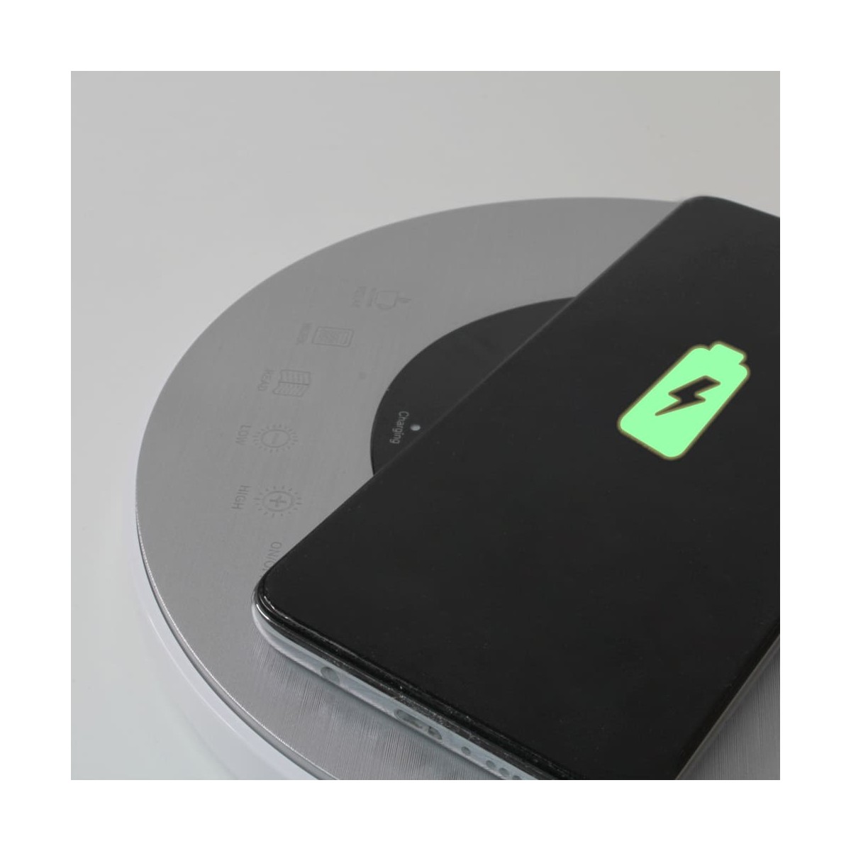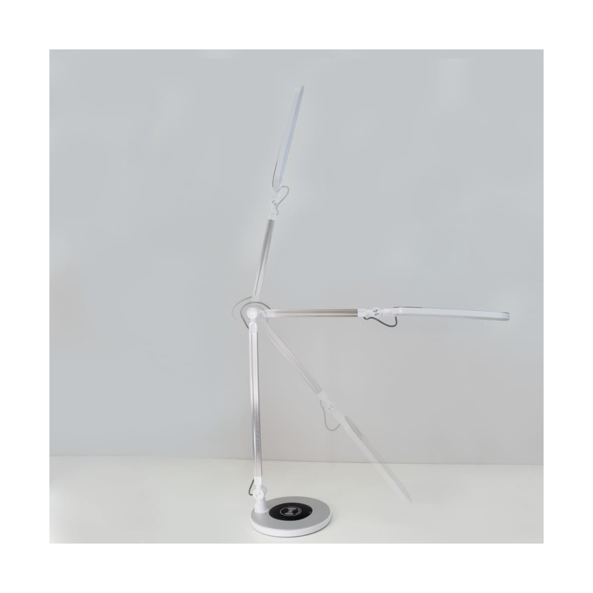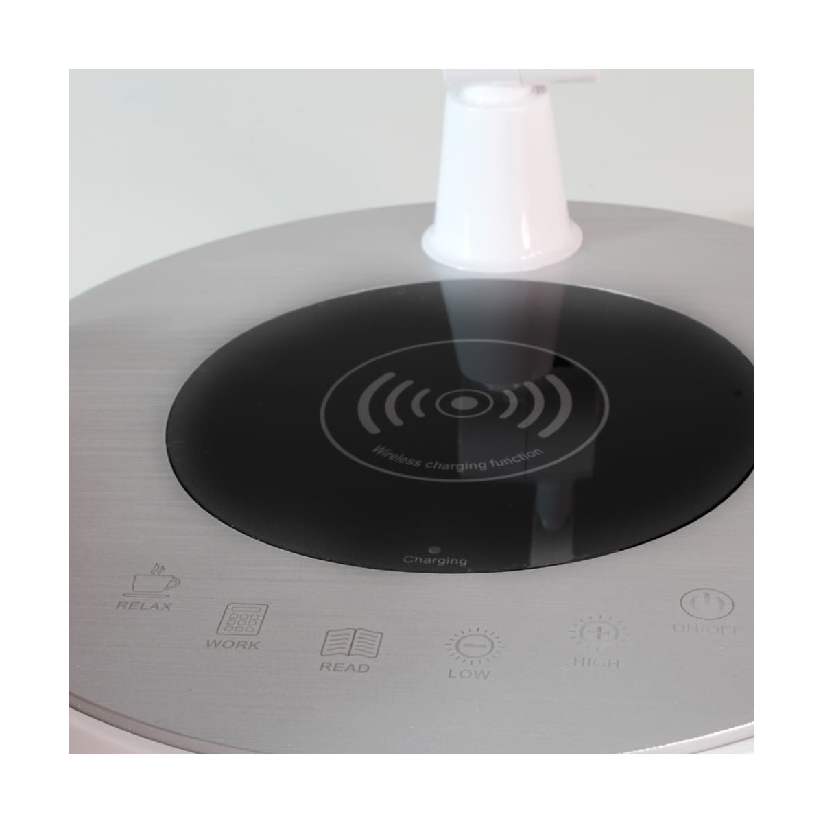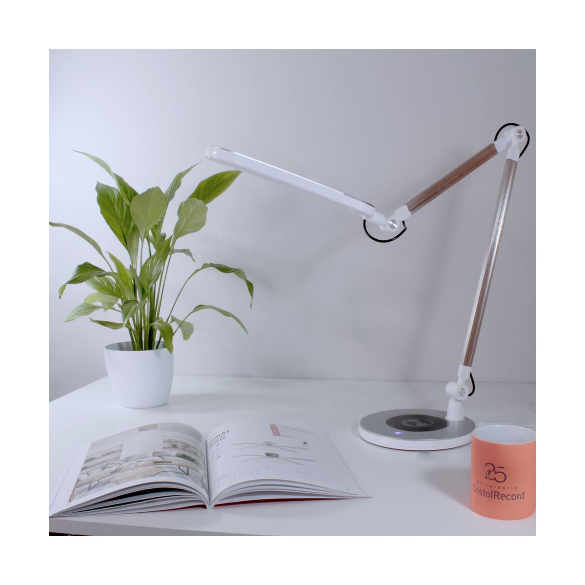 Lampe de bureau avec éclairage LED de 10W avec trois tons de lumière ; chaud, froid et neutre, avec une intensité réglable qui vous permet de créer différents éclairages pour répondre à tous les besoins. Elle comprend un chargeur sans fil dans la base qui permet de recharger les téléphones portables dotés de cette fonction. Le corps de la lampe est articulé.