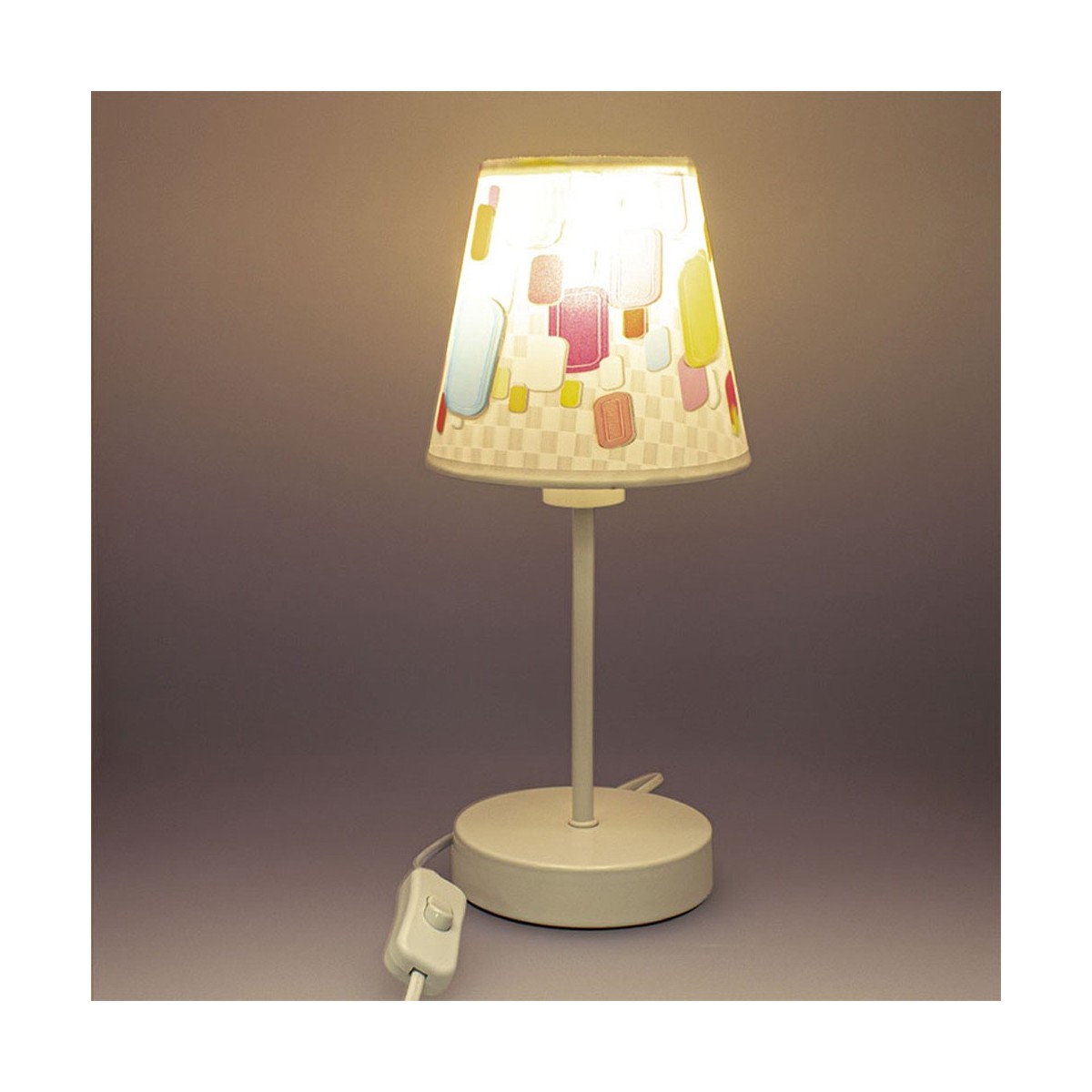 Lampe de table pour enfants avec des dessins géométriques de différentes couleurs sur l'écran en plastique et pied blanc. Idéal pour la décoration des chambres d'enfants. Remplacement facile de l'ampoule.