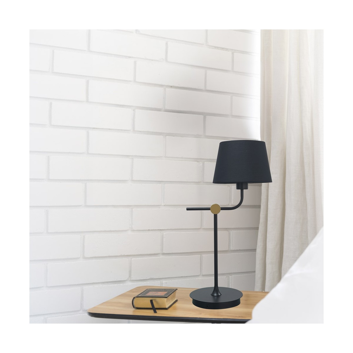 Lampe de table pour les chambres à coucher et les salons. Design minimaliste avec structure en métal noir et abat-jour en tissu assorti. Un petit détail doré sur la structure complète le design. Lampe à placer sur la table de chevet dans la chambre à coucher ou sur une table d'appoint dans le salon.