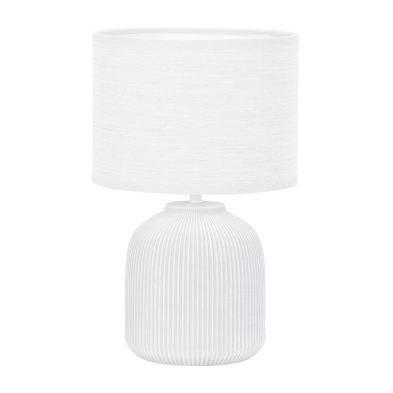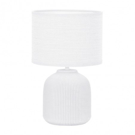 Lampe de table en céramique blanche Delfi. Lampe de table à poser sur une table de chevet dans une chambre ou sur une table d'appoint dans un salon. Base en céramique blanche et abat-jour en tissu blanc. Interrupteur ON-OFF sur le câble. Ampoule non incluse.