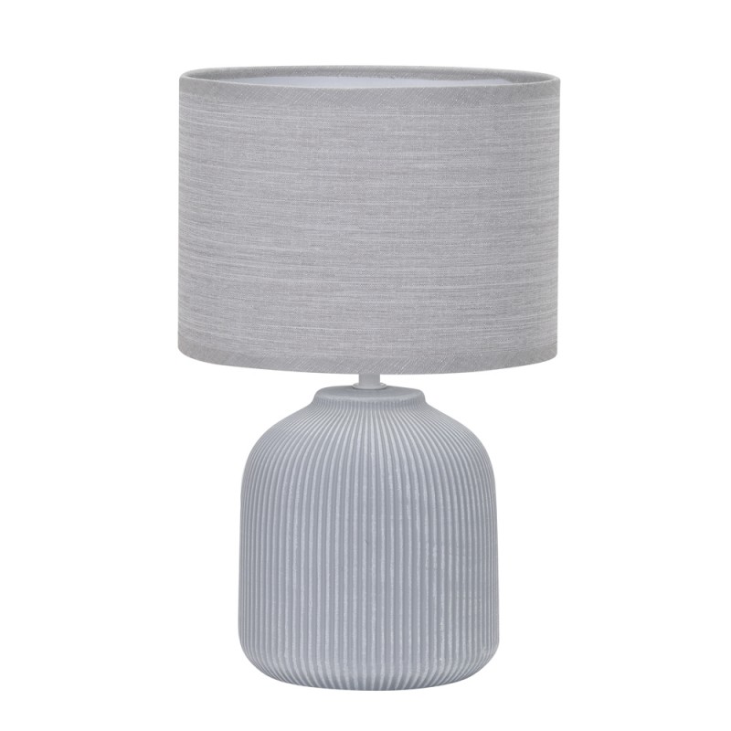 Lampe de table en céramique grise Delfi. Lampe de table à poser sur une table de chevet dans une chambre ou sur une table d'appoint dans un salon. Base en céramique grise et abat-jour en tissu gris. Interrupteur ON-OFF sur le câble. Ampoule non incluse.