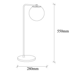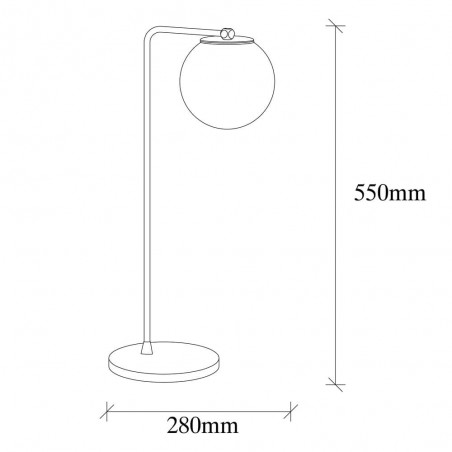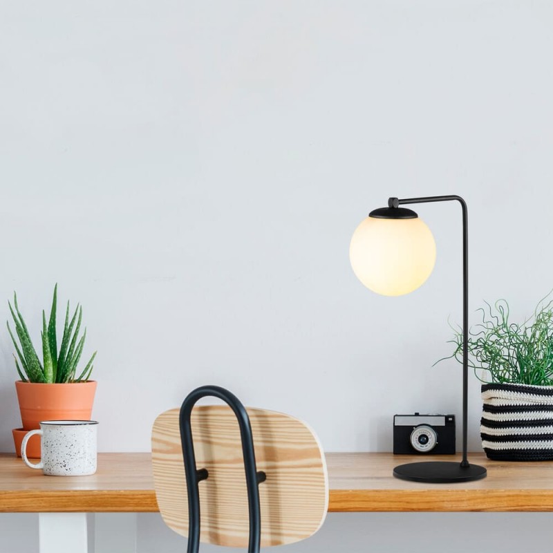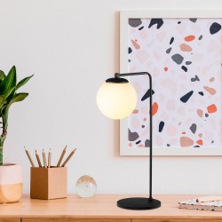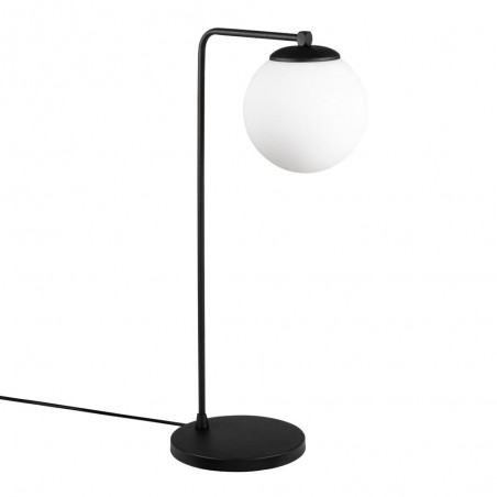Lampe de table décorative dans un style simple. Corps fixe en métal laqué noir avec une base ronde de 12 cm et un abat-jour en verre blanc dépoli. Hauteur totale 55 cm. Pour ampoule E27, non incluse.