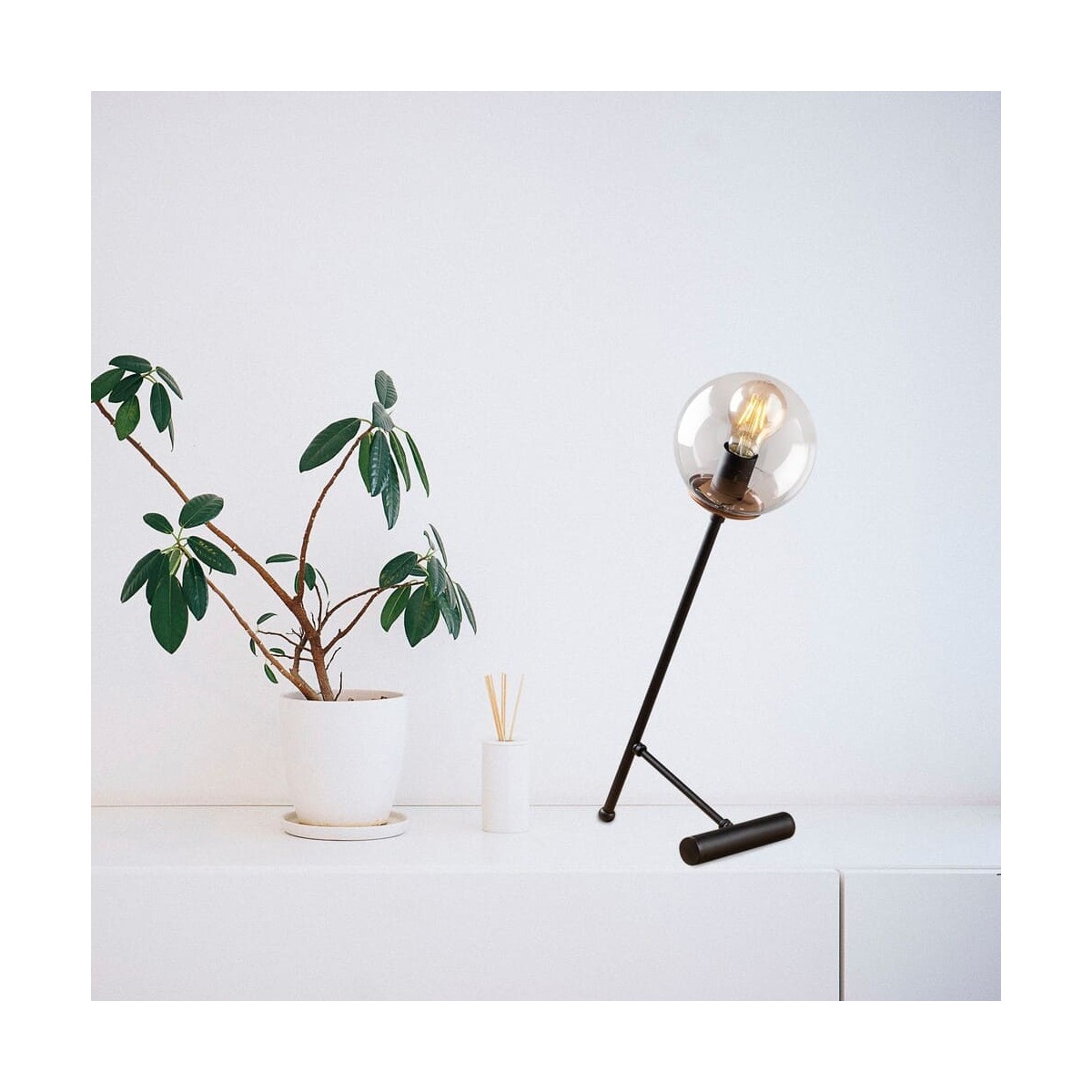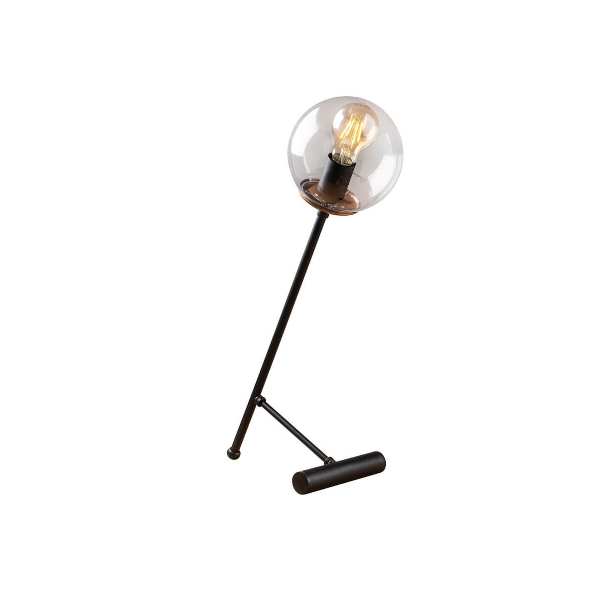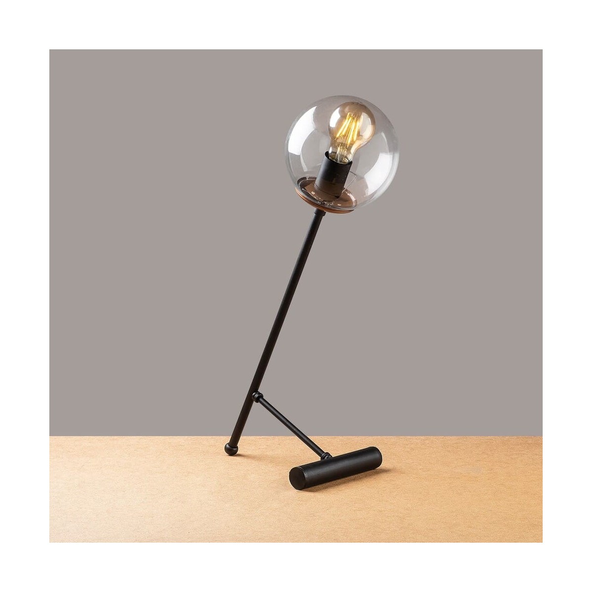 Lampe de table décorative au design simple, en métal laqué noir mat avec un abat-jour en verre transparent sphérique. Il fonctionne avec une ampoule E27, non incluse.