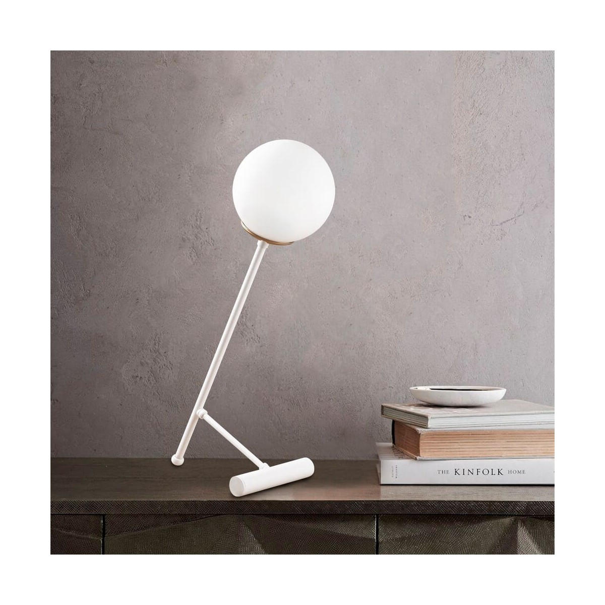 Lampe de table décorative au design simple, réalisée en métal laqué blanc mat avec un abat-jour sphérique en verre blanc mat. Il fonctionne avec une ampoule E27, non incluse.
