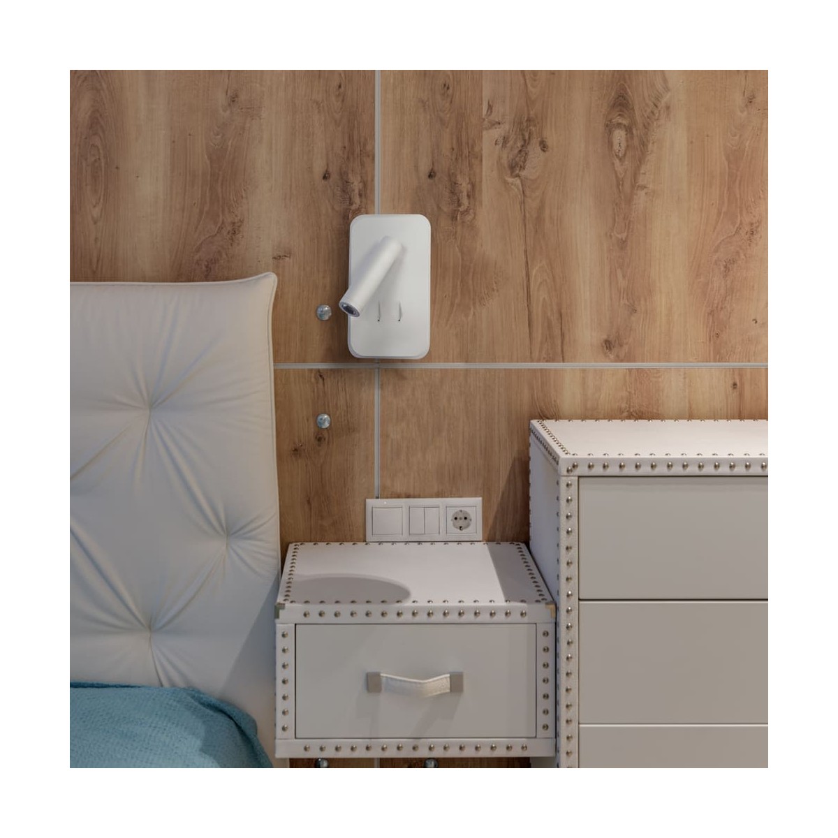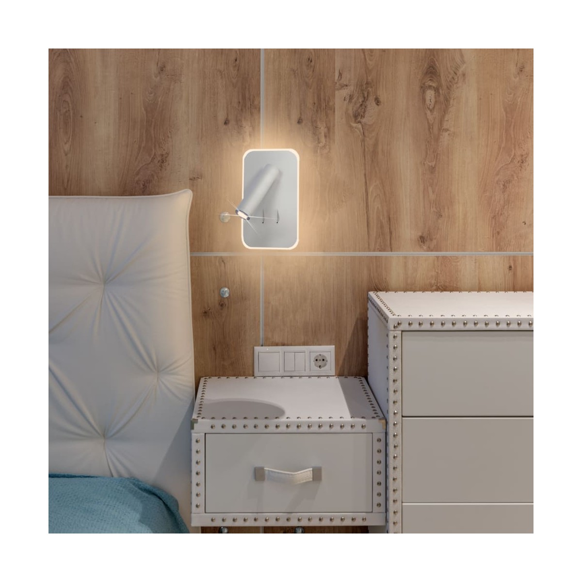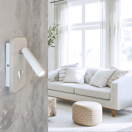 Irena Applique avec double éclairage. Elle dispose d'un spot de 3W en température chaude qui peut être dirigé, et d'un cadre lumineux, également en température chaude de 11 W, qui vous fournira un éclairage d'ambiance. Vous pouvez les allumer et les éteindre individuellement ou séparément. Trois lumières différentes dans la même applique. Une lumière moderne pour l'éclairage de chevet. Fabriquée en aluminium laqué blanc. Existe également en noir.