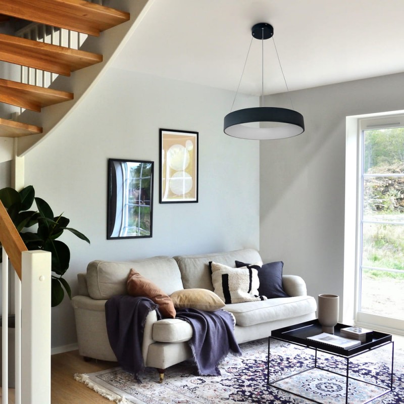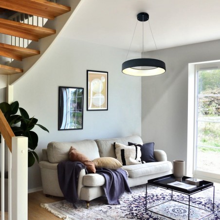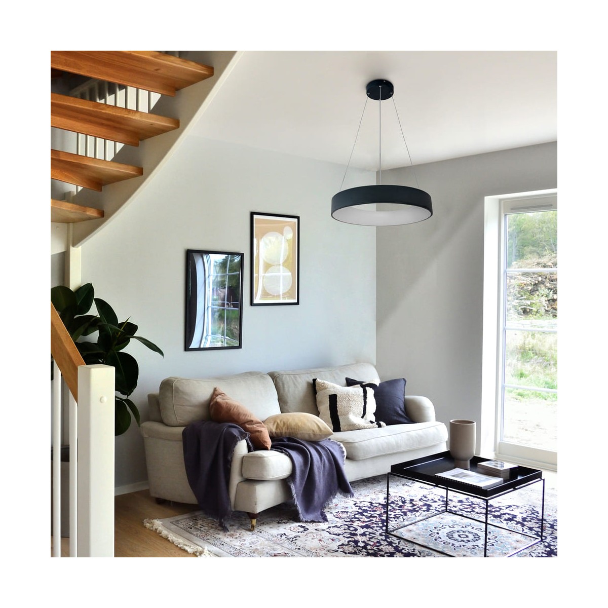 Suspension á LED Lyn avec intensité réglable et trois températures de couleur. Abat-jour circulaire en forme d'anneau avec un diffuseur en polycarbonate courant à l'intérieur. Vous pouvez régler la lumière à votre convenance à l'aide de la télécommande. Il dispose également d'une mémoire de mise sous tension, de sorte que lorsque la lumière est allumée et éteinte, elle reste sur le dernier réglage. Fabriqué en aluminium gris anthracite.