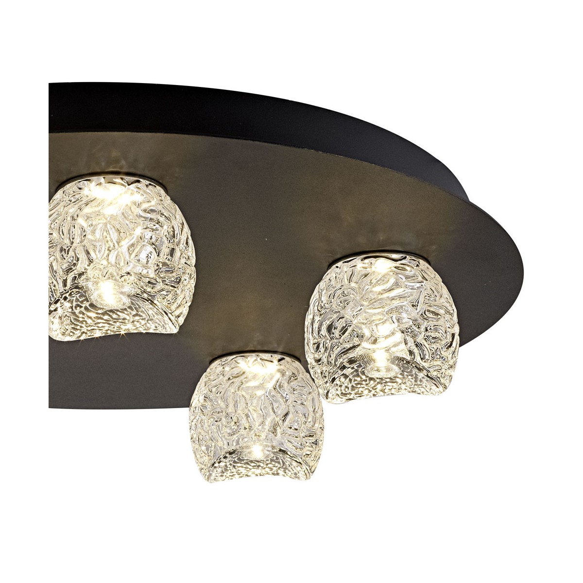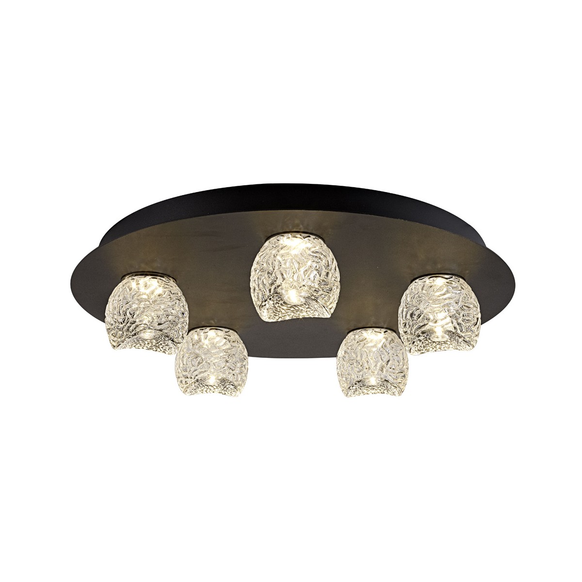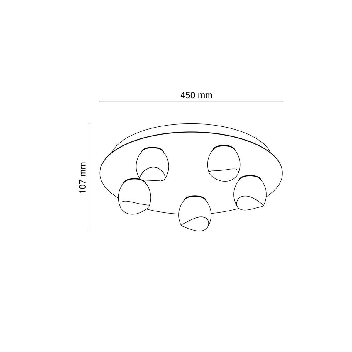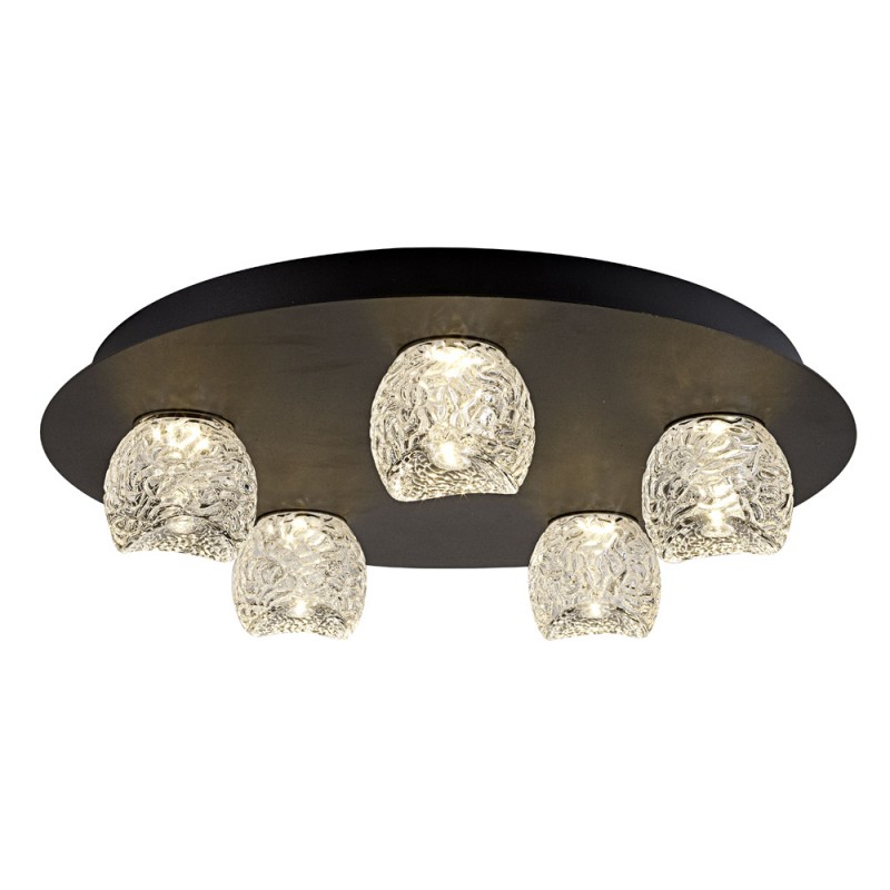 Plafonnier avec LED COB intégrée de la collection Fany. Il possède 5 tulipes de verre pressé. 25W de lumière chaude (3000K) 1800lm.