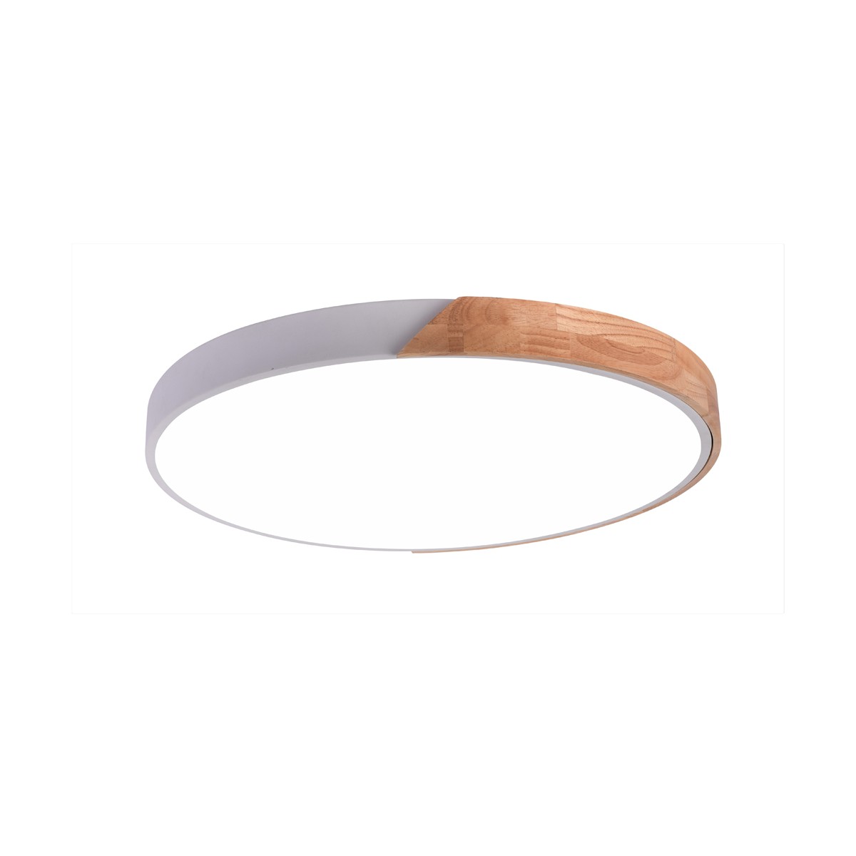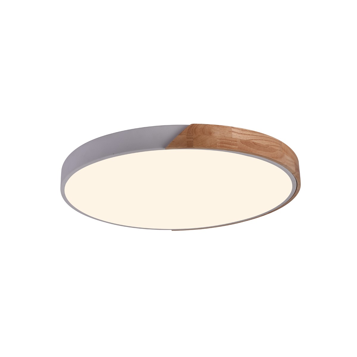 Plafonnier Taoro LED avec technologie SMART. Plafonnier circulaire en blanc avec une pièce décorative en bois. Vous pouvez régler l'intensité des lumens et sélectionner la température de couleur de l'éclairage (3000-4000-6000K). Mémoire marche/arrêt et mode veilleuse. Le plafonnier est équipé d'une télécommande et peut également être contrôlé par smartphone via une connexion Bluetooth (technologie intelligente).