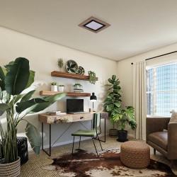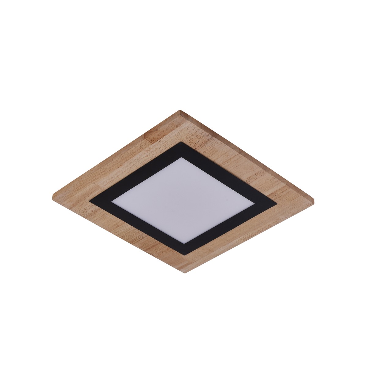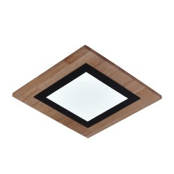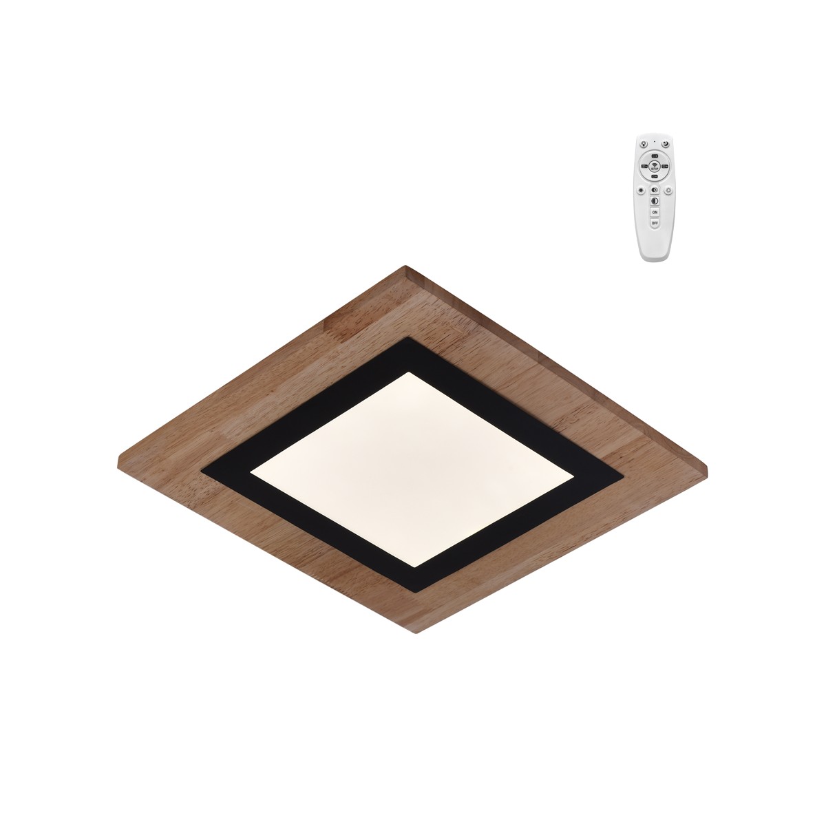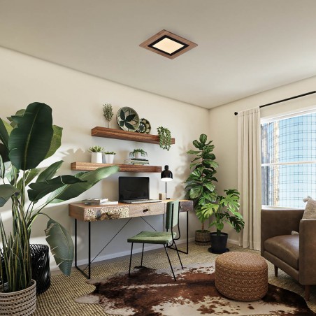 Plafonnier LED intelligent pour les halls d'entrée et les chambres. Plafonnier carré doté de la technologie Smart et du Bluetooth pour contrôler l'éclairage depuis un smartphone ou une tablette. Design simple de forme carrée en couleur bois et cadre intérieur noir. Il dispose d'un éclairage LED intégré de 24W et 1400 lumens réglable en tonalité et en intensité de lumière. Télécommande incluse.