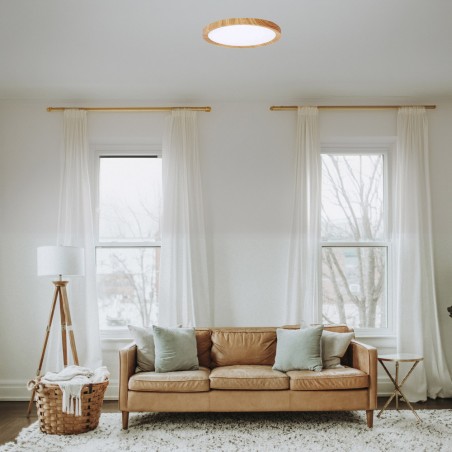 Plafonnier de surface avec trois températures de couleur. Plafonnier LED circulaire ultra-mince, parfait pour l'éclairage fonctionnel des espaces intérieurs. Il dispose de trois températures de couleur (3000-4000-6500K)* et de trois intensités lumineuses (10-50-100%)**. Installation facile directement dans le plafond et design ultra fin (25 mm). Cadre en aluminium bois et diffuseur acrylique.
