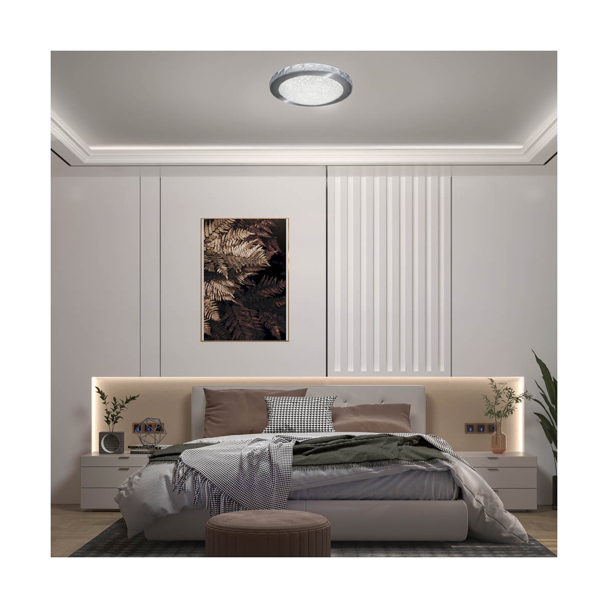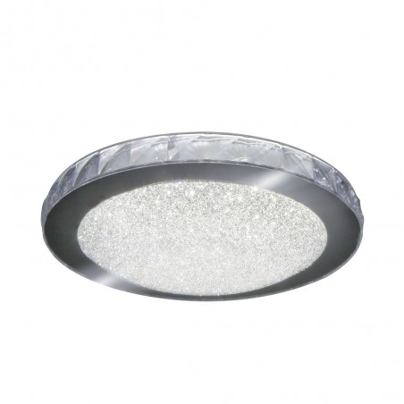 Plafonnier avec diffuseur en verre. Plafonnier avec éclairage LED blanc naturel (4000K) idéal pour éclairer les chambres et les salons. Anneau en métal nickelé avec diffuseur pc à effet de verre autour et petits cristaux en bas. Il dispose d'un éclairage LED intégré de 35W, 2000 lumens et 4000K. Hauteur 7 cm. et diamètre 35 cm.