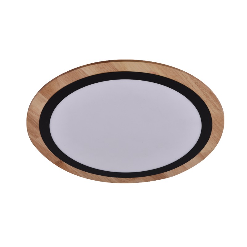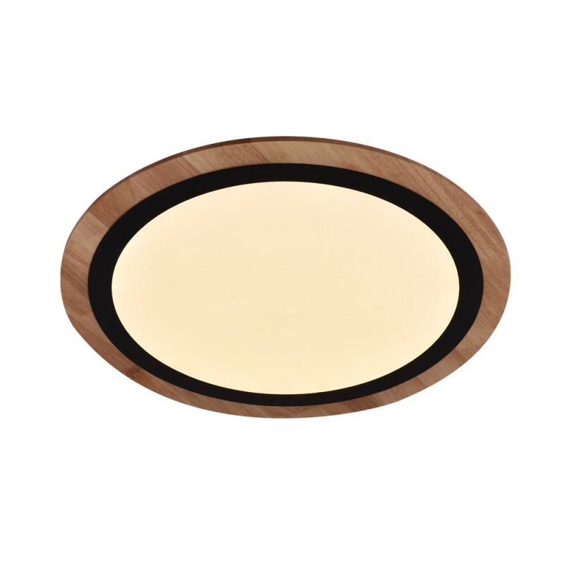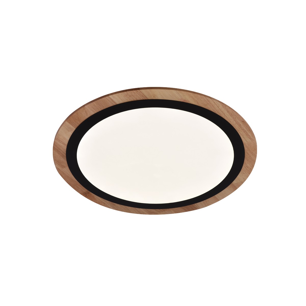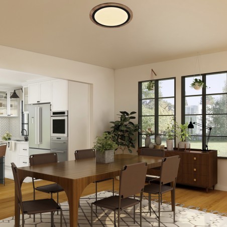 Plafonnier LED intelligent pour les salons et les chambres à coucher. Plafonnier circulaire doté de la technologie Smart et du Bluetooth pour contrôler l'éclairage à partir d'un smartphone ou d'une tablette. Design circulaire compact en couleur bois et anneau intérieur noir. Il dispose d'un éclairage LED intégré de 38W avec 3350 lumens, réglable en tonalité et en intensité de lumière. Télécommande incluse.