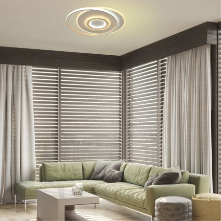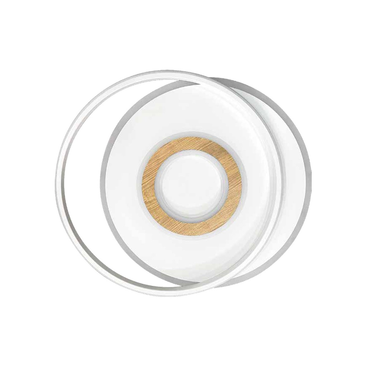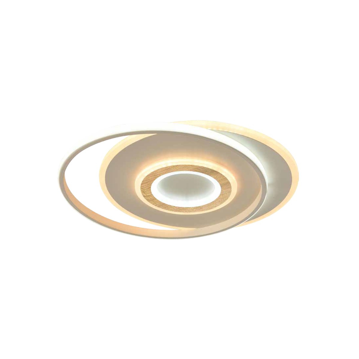 Plafonnier LED décoratif composé de différents anneaux superposés créant un design géométrique. La partie centrale est décorée d'un effet bois. Il intègre un éclairage LED de 75W avec changement de température CCT et intensité réglable. Mode veilleuse et fonction de mémorisation de la mise sous tension. Télécommande incluse.