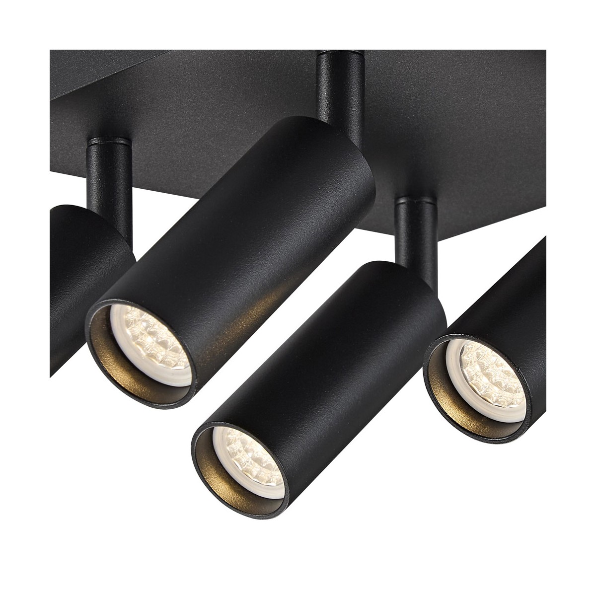 Plafonnier avec quatre spots orientables. Spots tubulaires en aluminium noir sablé, pour ampoules LED G9 (non incluses). Chaque spot peut être déplacé individuellement pour diriger la lumière vers l'endroit désiré. La base mesure 250 x 250 mm.