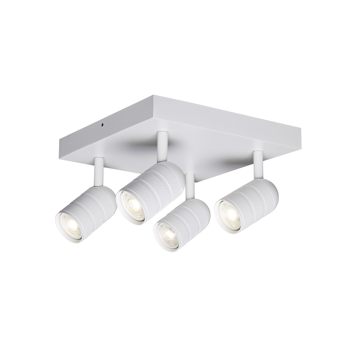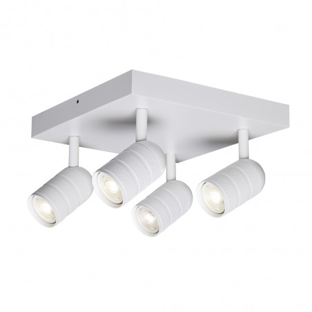 Plafonnier avec spots réglables. Les spots sont conçus pour fonctionner avec des ampoules GU10-35 (non incluses). Chaque spot peut être déplacé individuellement pour diriger la lumière vers l'endroit désiré. Finition blanc sablé. Base 200x200 mm.