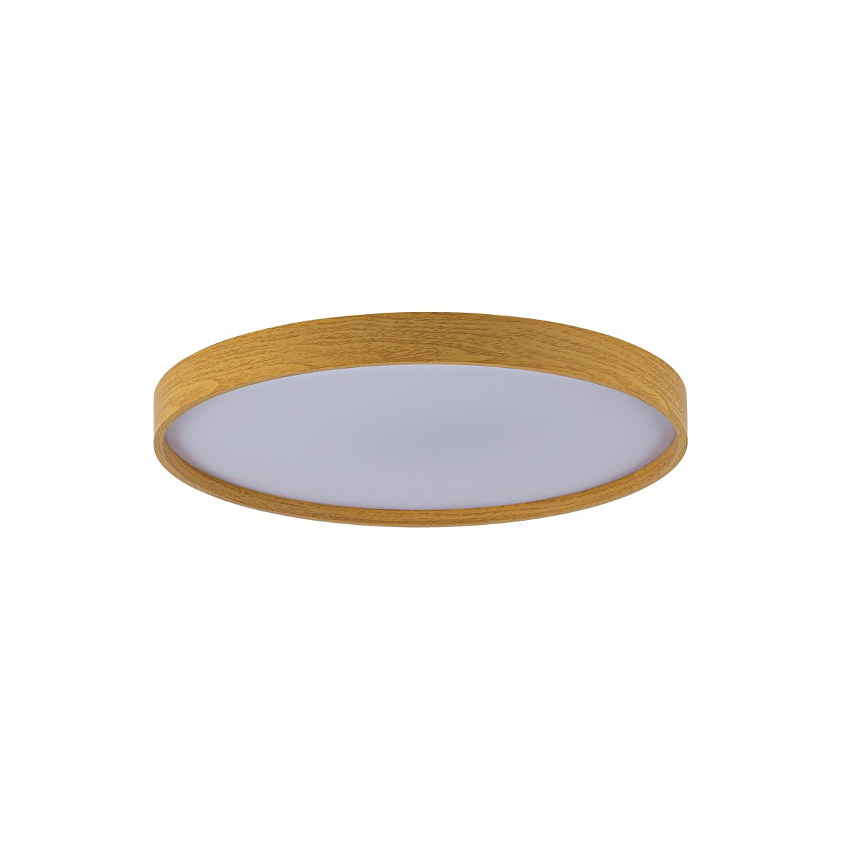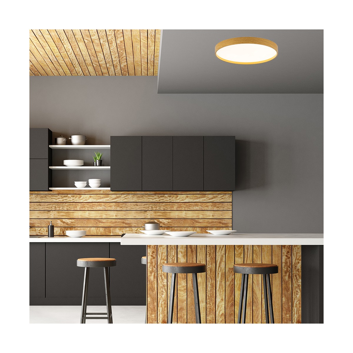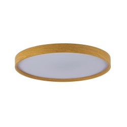 Plafonnier LED Panam 3CCT à intensité variable. Plafonnier de 40 centimètres avec une décoration en bois qui lui confère une touche nordique. Il dispose d'un éclairage LED intégré avec trois intensités (20-50-100%) et trois nuances de couleurs (3000-4000-6000K), ainsi que la possibilité de les régler progressivement. Il dispose d'une configuration de l'éclairage en mode nuit, d'une mémoire d'allumage et d'une minuterie (1-2H) pour programmer l'extinction. Télécommande incluse. LED 46W, 5060 lm. et 3CCT.