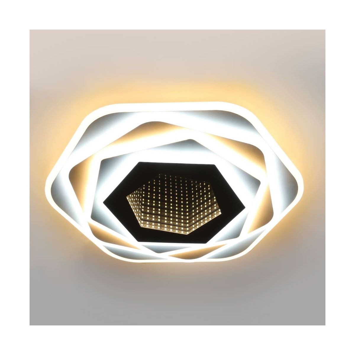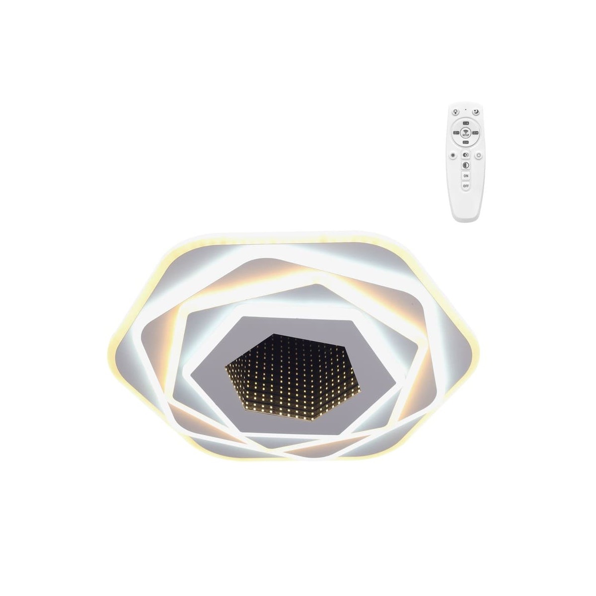 Plafonnier décoratif à LED avec éclairage LED intégré à trois températures. La structure du plafonnier crée différents anneaux de lumière qui peuvent être combinés avec différentes nuances de lumière pour créer différentes lumières. Grâce à la commande incluse, en plus de régler la tonalité de la lumière, il est possible de réguler l'intensité et de l'allumer ou de l'éteindre. Il dispose d'un mode d'éclairage nocturne et d'une fonction de mémoire pour récupérer le dernier réglage d'éclairage.