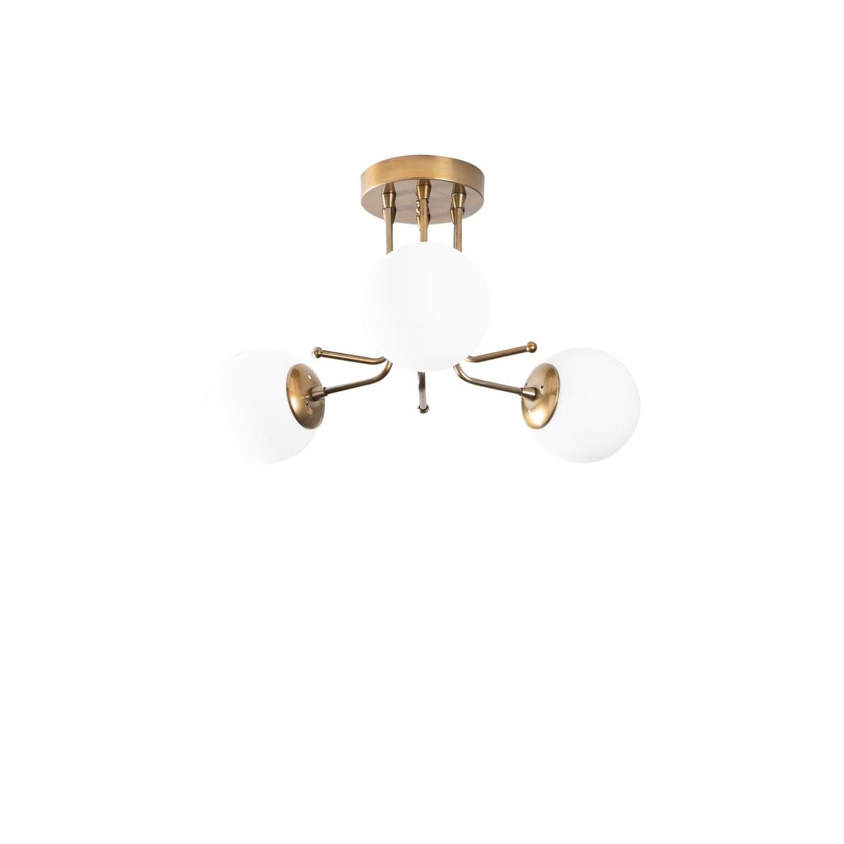 Plafonnier décoratif à trois lumières avec corps en métal doré et abat-jour en verre blanc mat. Plafonnier de 34 cm de haut, style lustre. Pour ampoules E27, non incluses.