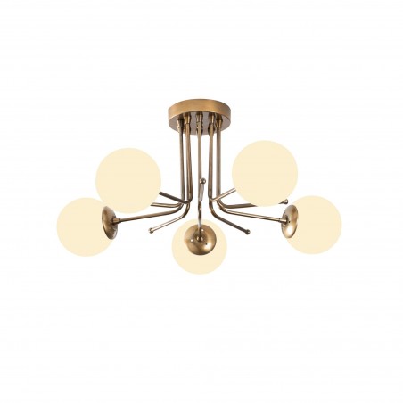 Plafonnier décoratif à cinq lumières avec corps en métal doré et abat-jour en verre blanc mat. Plafonnier de 34 cm de haut, style lustre. Pour ampoules E27, non incluses.