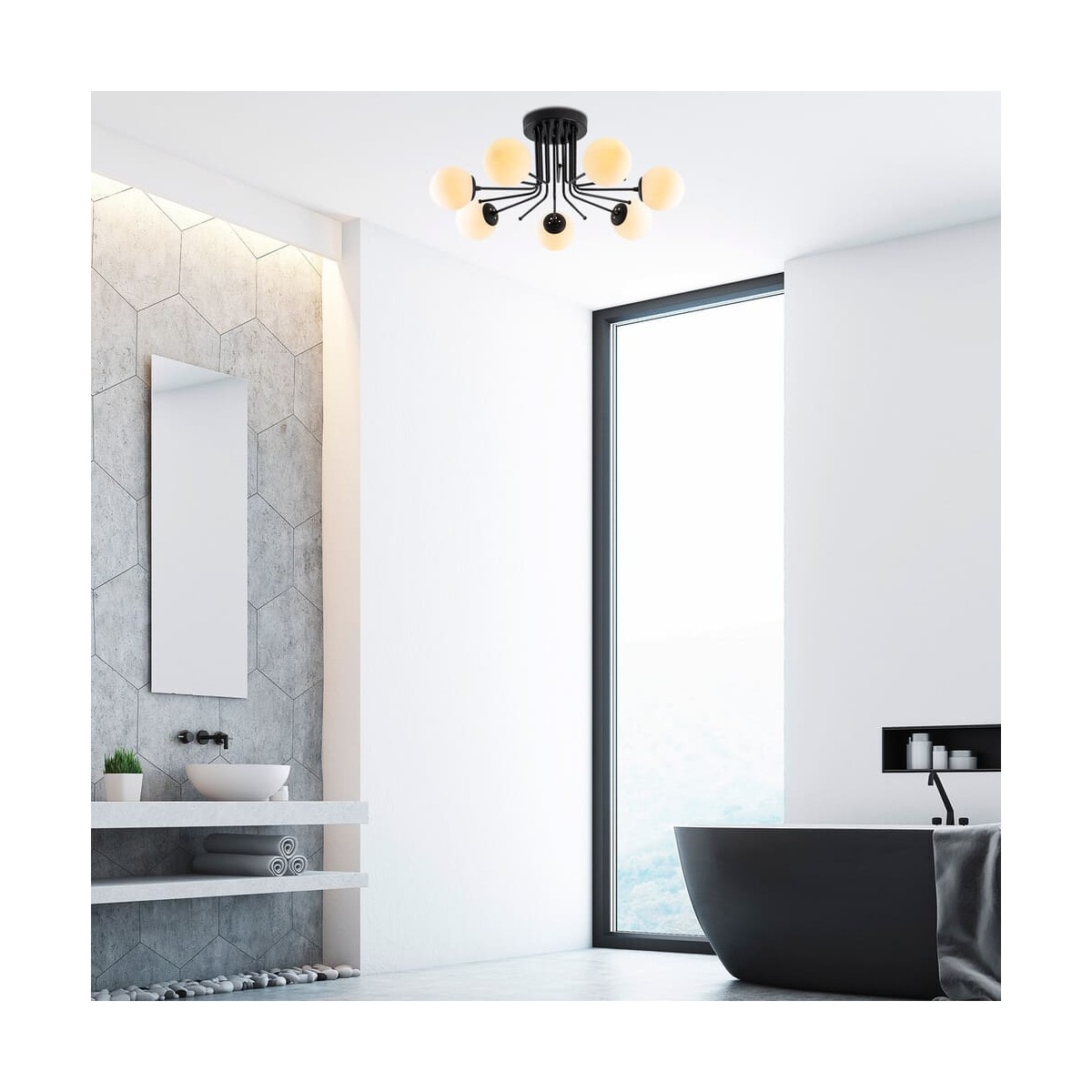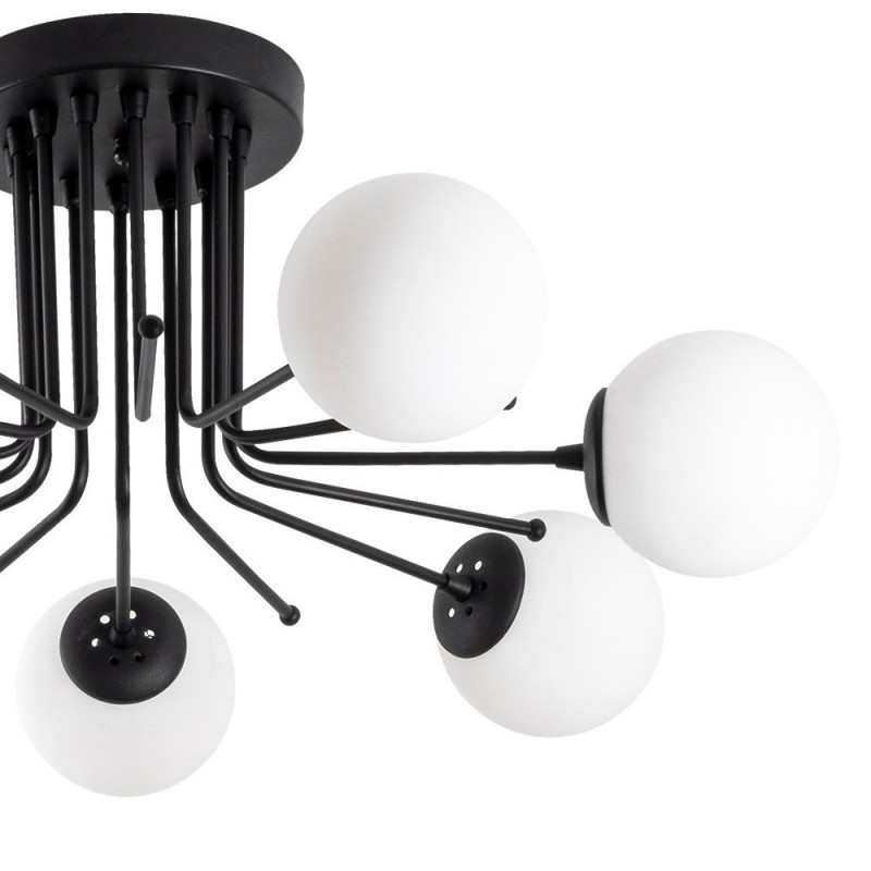 Plafonnier décoratif à sept lumières avec corps en métal laqué noir et abat-jour en verre blanc mat. Plafonnier de 34 cm de haut, style lustre. Pour ampoules E27, non incluses.