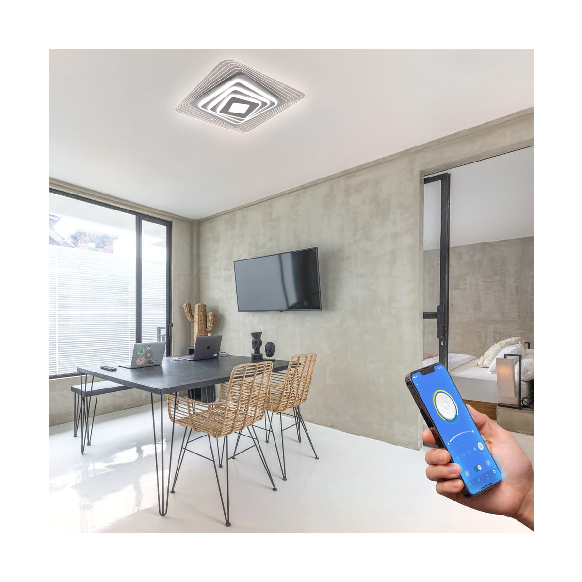 Plafonnier décoratif intelligent avec trois tons de lumière. À partir de l'application mobile et de la télécommande fournie, vous pouvez régler l'intensité et la couleur de la lumière et définir le mode nuit par défaut. Il dispose d'une fonction de mémoire permettant de retrouver le dernier éclairage réglé.