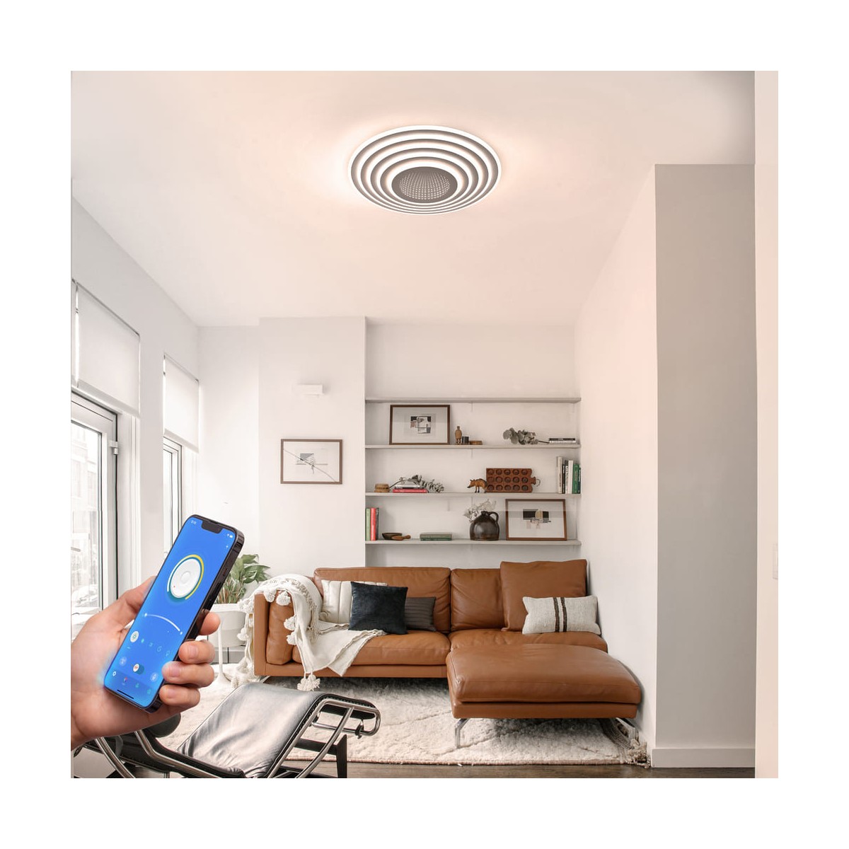 Plafonnier décoratif intelligent avec trois tons de lumière. À partir de l'application mobile et de la télécommande fournie, vous pouvez régler l'intensité et la couleur de la lumière et définir le mode nuit par défaut. Il dispose d'une fonction de mémoire permettant de retrouver le dernier éclairage réglé.