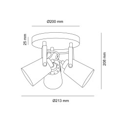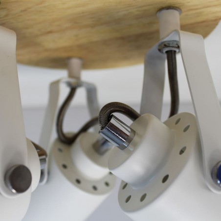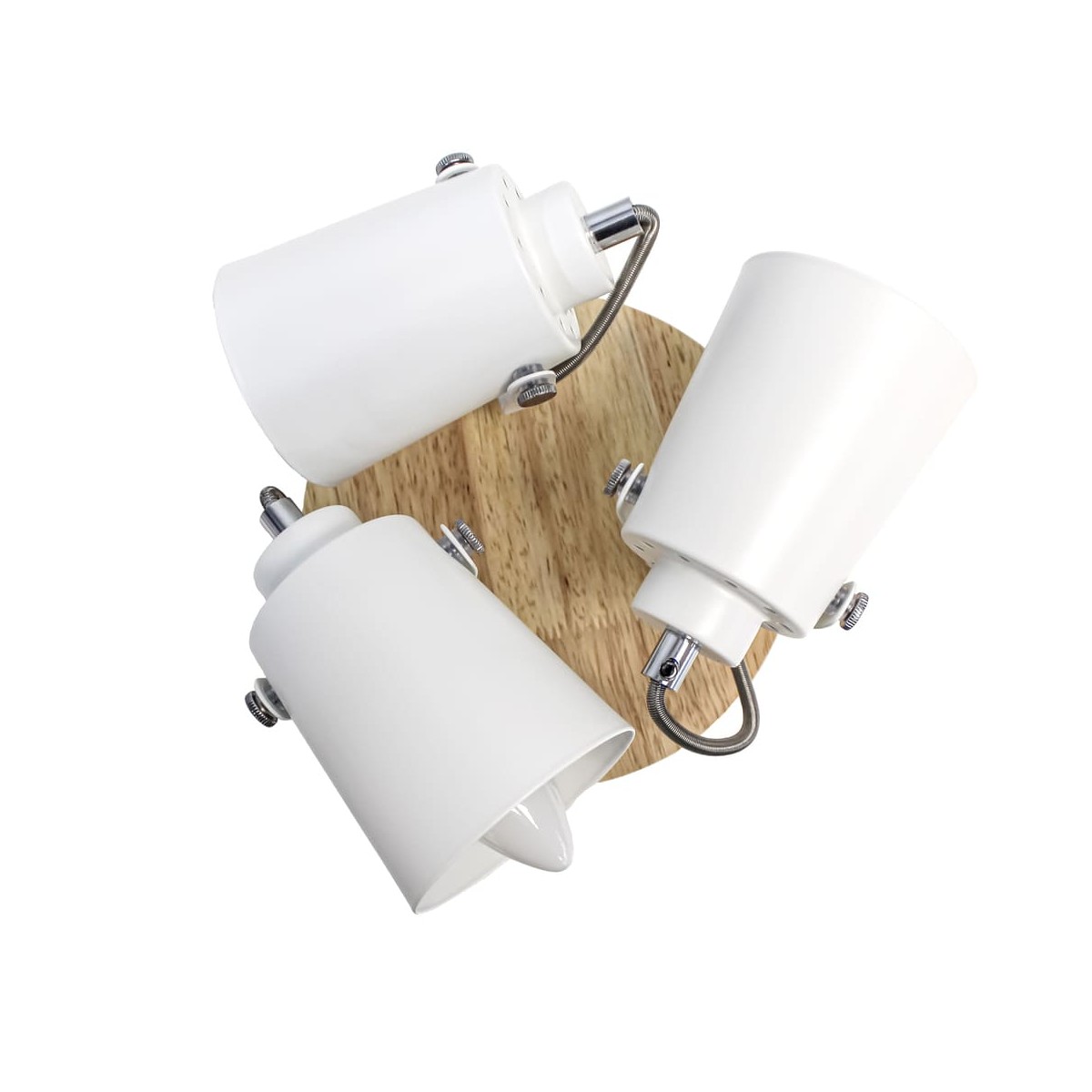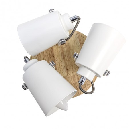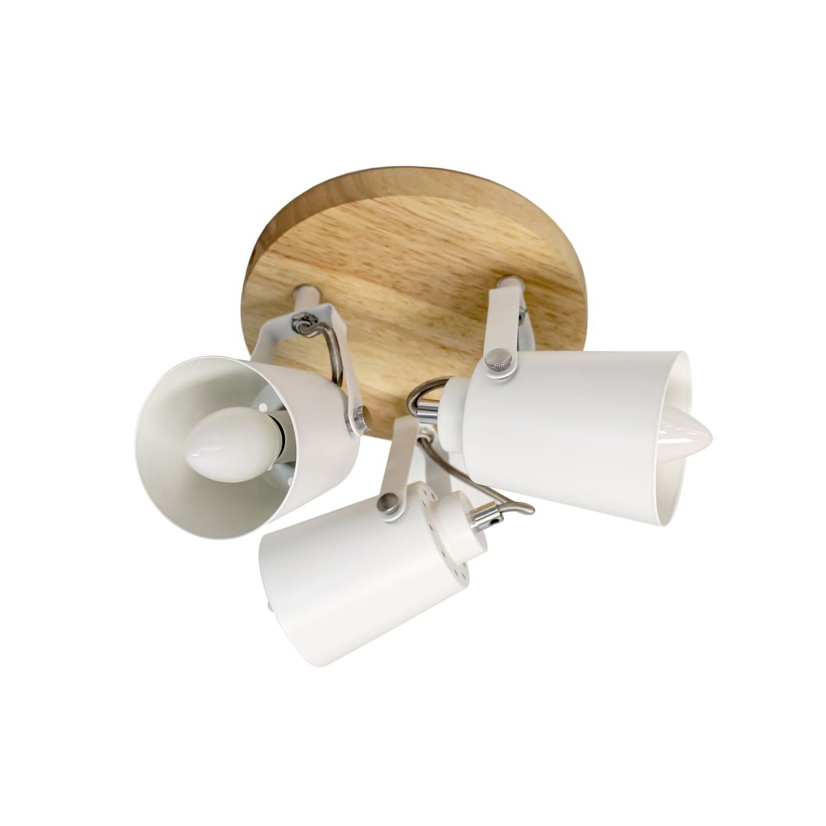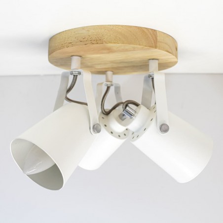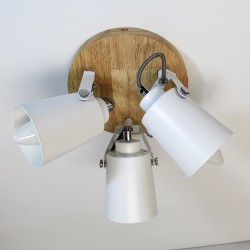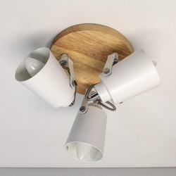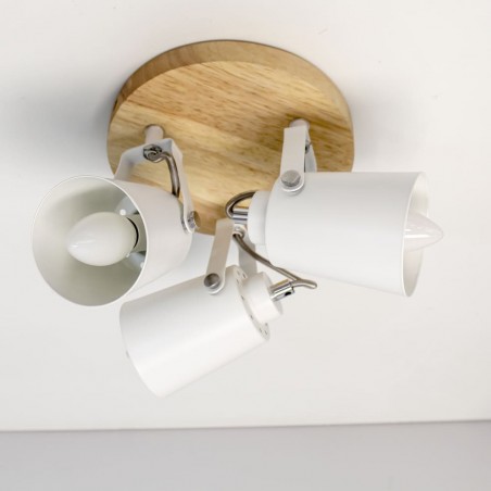 Plafonnier décoratif avec trois spots en aluminium blanc mat pour ampoules E14, non incluses. Les projecteurs peuvent être déplacés pour diriger la lumière vers l'endroit souhaité. La base circulaire de 20 cm est en bois naturel.