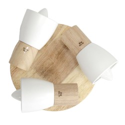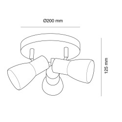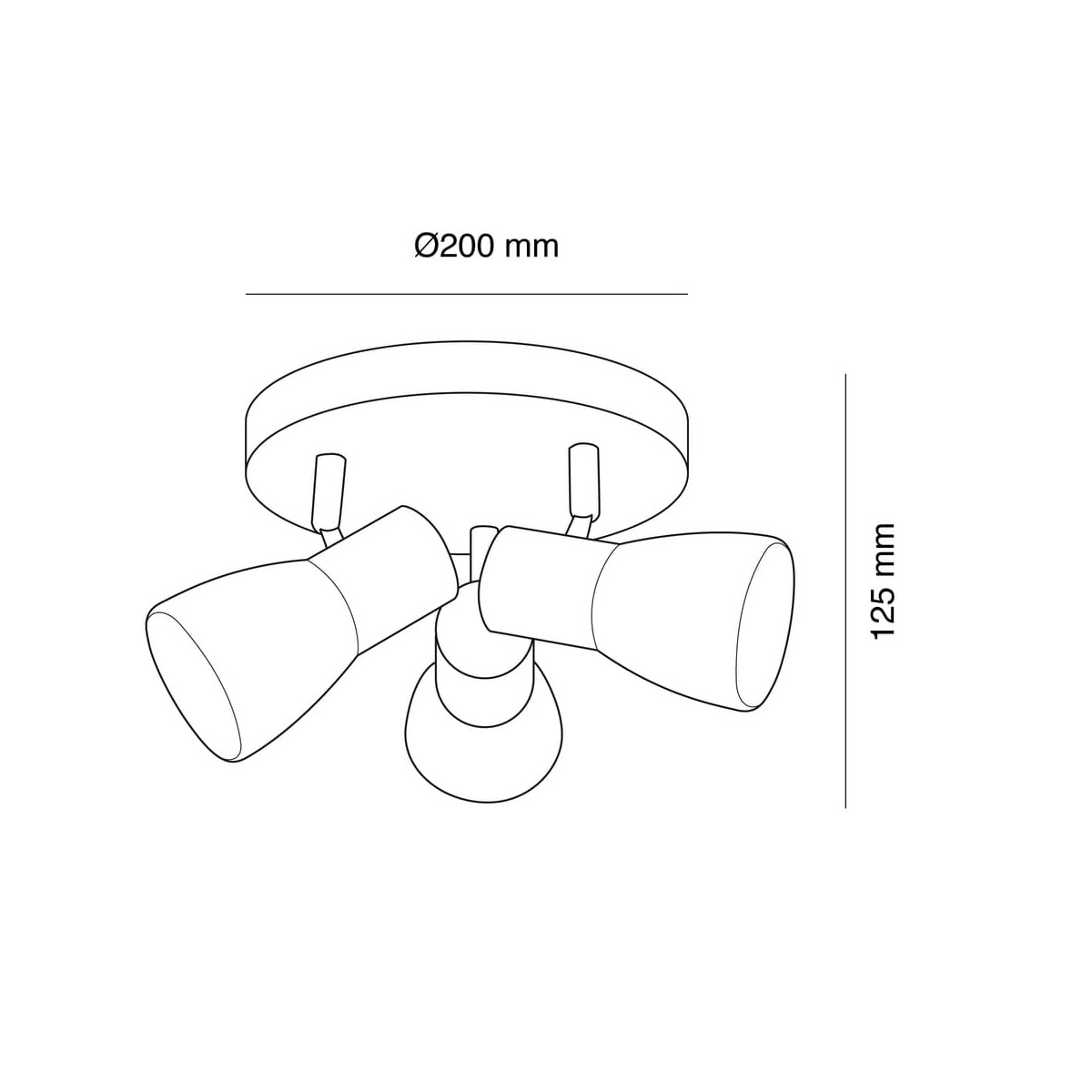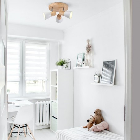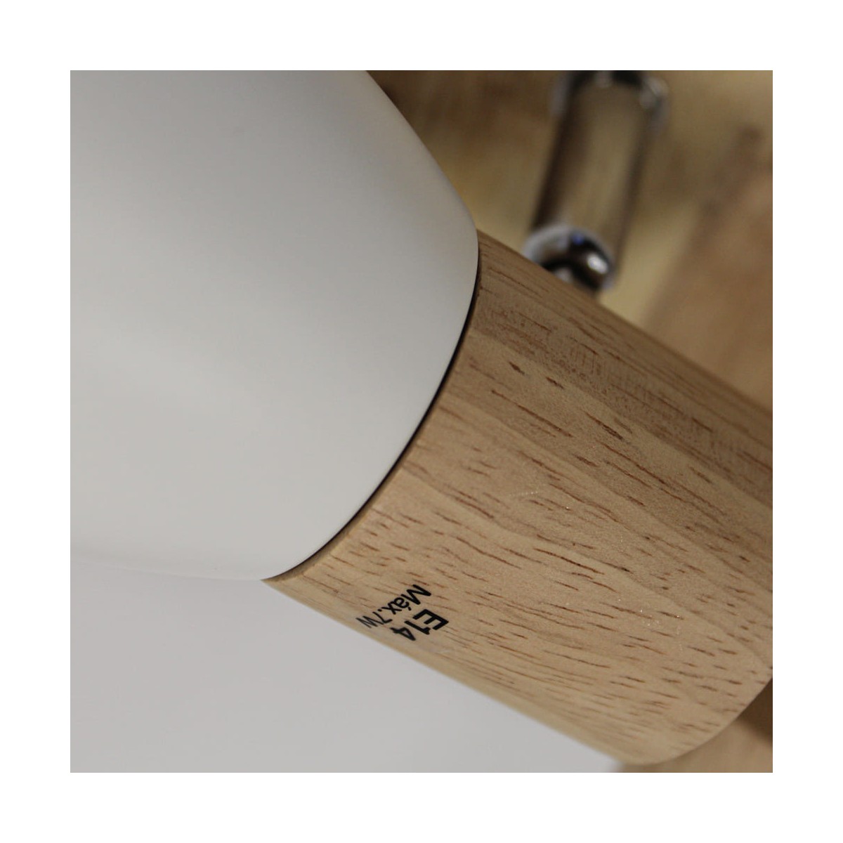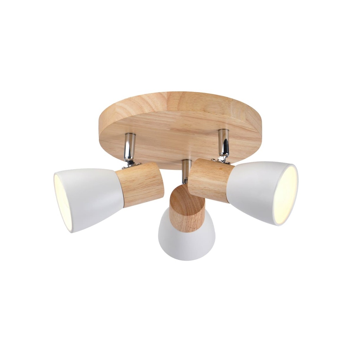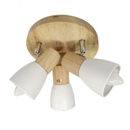 Plafonnier décoratif avec trois spots en aluminium blanc mat pour ampoules E14, non incluses. Les projecteurs peuvent être déplacés pour diriger la lumière vers l'endroit souhaité. La base circulaire de 20 cm est en bois naturel.
