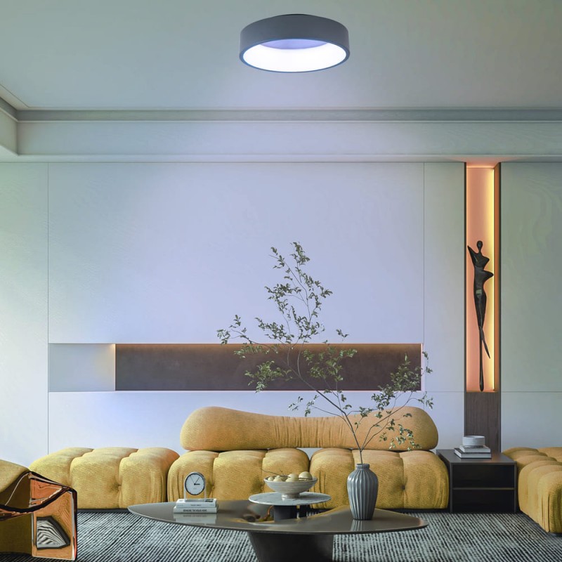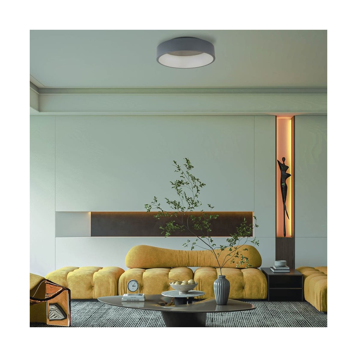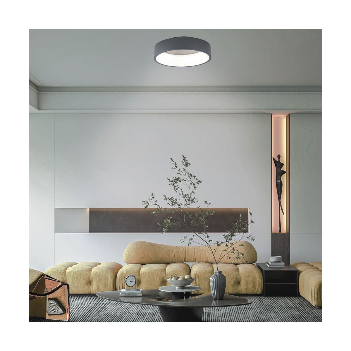 Plafonnier à LED Silen avec trois températures de couleur. Plafonnier circulaire avec télécommande pour régler l'intensité des lumens et la tonalité des couleurs de l'éclairage. Fabriqué en aluminium gris anthracite et diffuseur en polycarbonate. Il dispose d'une mémoire de mise sous tension, de sorte que lorsqu'il est allumé et éteint, la dernière configuration lumineuse est conservée.