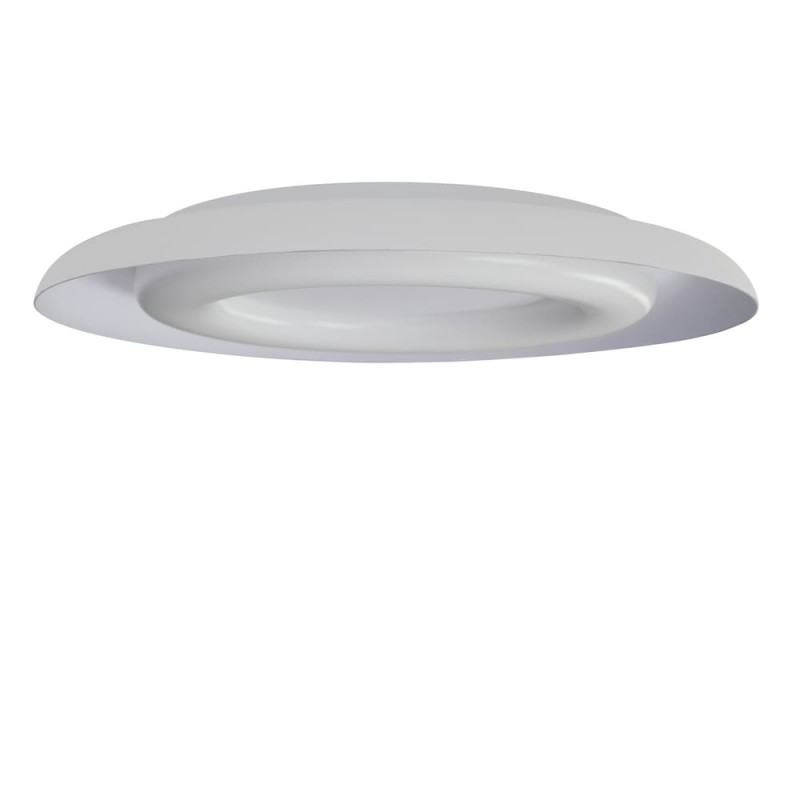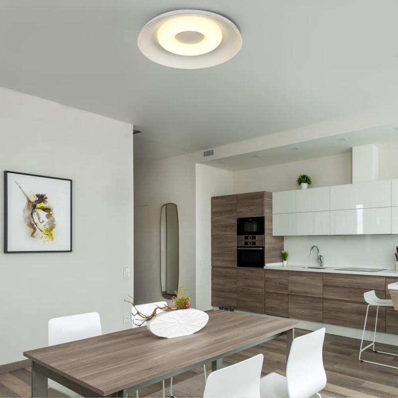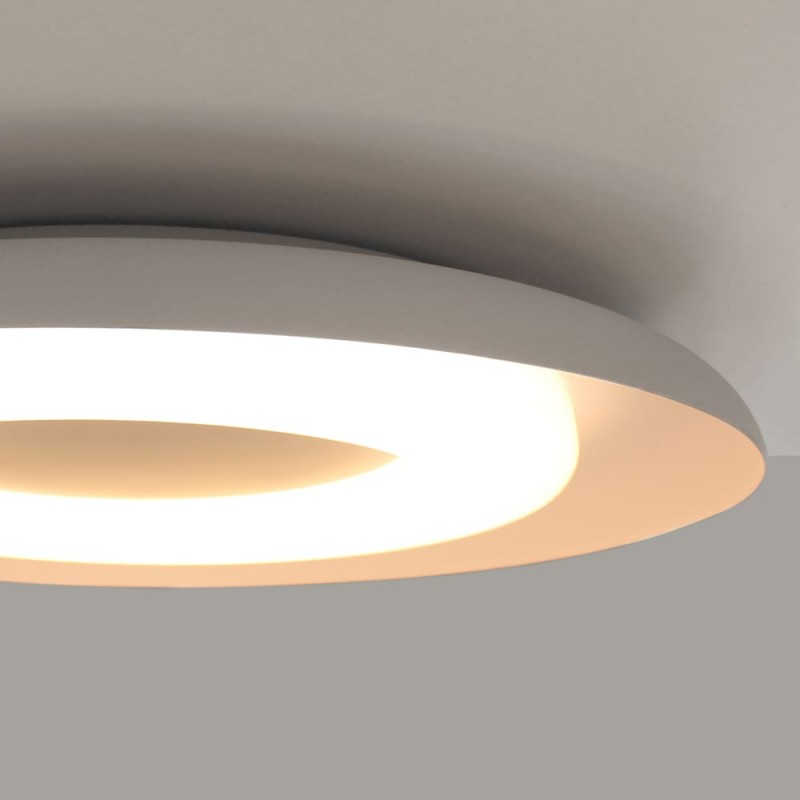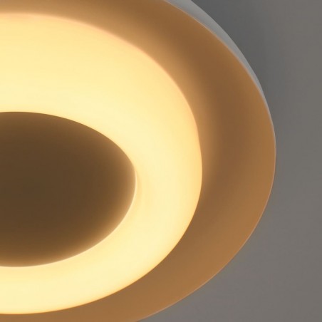 Plafonnier pour cuisines et salons modernes. Plafonnier circulaire en aluminium blanc et diffuseur en polycarbonate. La lumière est projetée uniformément à travers le diffuseur annulaire pour éclairer les pièces telles que les salons ou les cuisines. Il dispose d'un éclairage LED intégré dans un ton chaud et d'une puissance de 36W.
