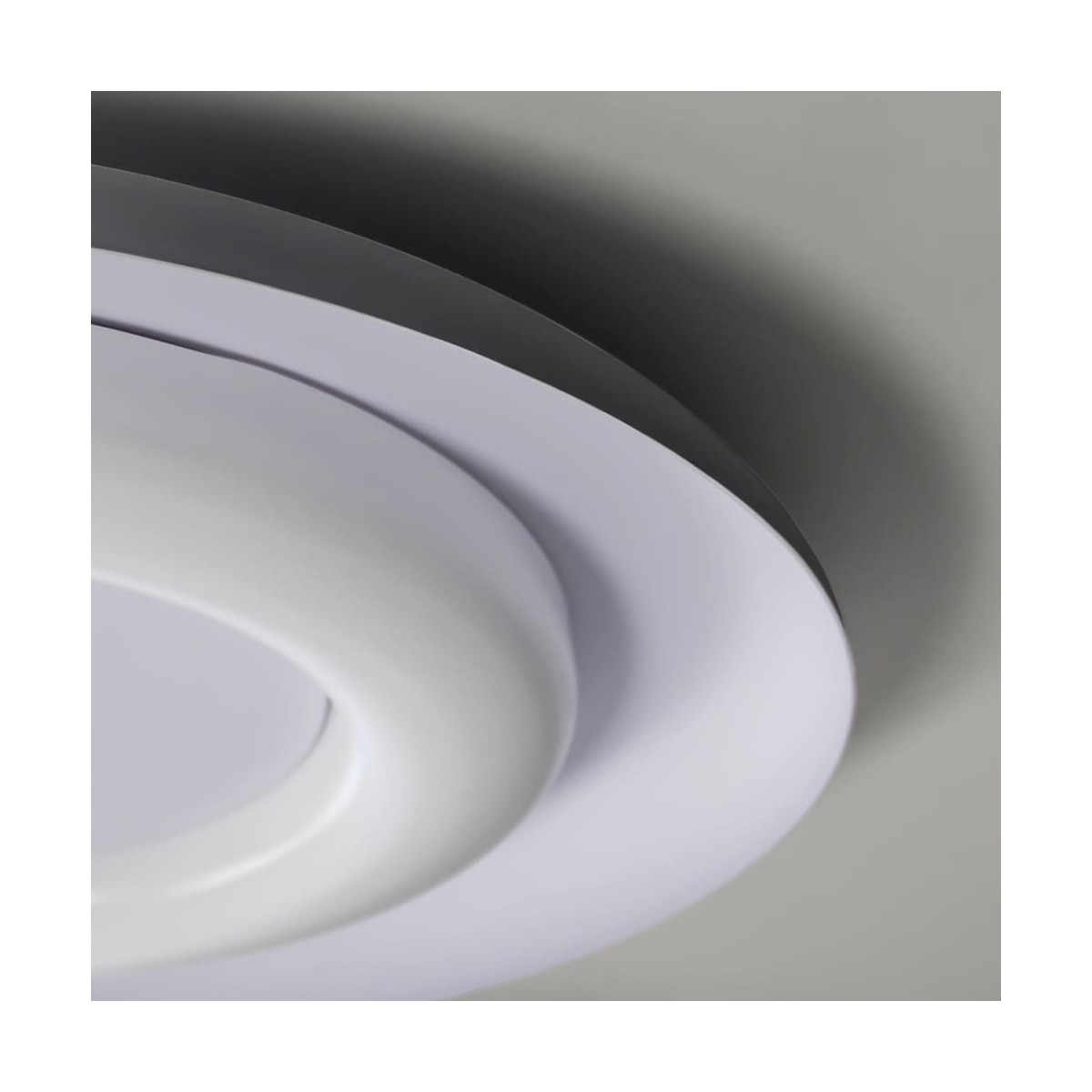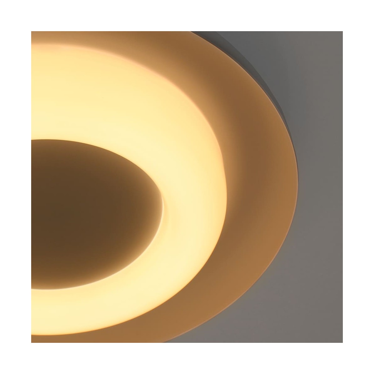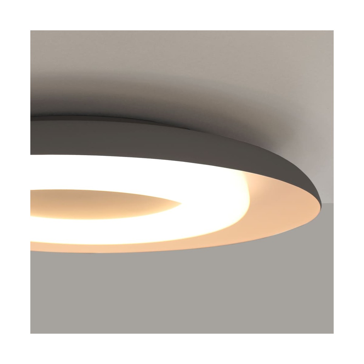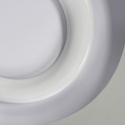 Plafonnier circulaire à lumière chaude. Plafonnier de style moderne conçu pour fournir un éclairage principal dans les chambres et les salons. Le diffuseur, fabriqué en polycarbonate, est conçu en forme d'anneau et projette une lumière uniforme. La partie extérieure du plafonnier est en aluminium gris, ce qui contraste avec la couleur blanche de la partie intérieure. Idéal pour une installation dans des plafonds bas d'une hauteur de 65 mm.