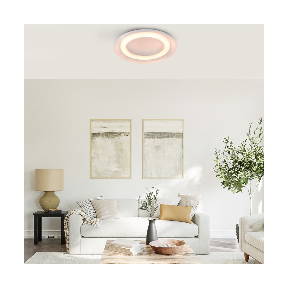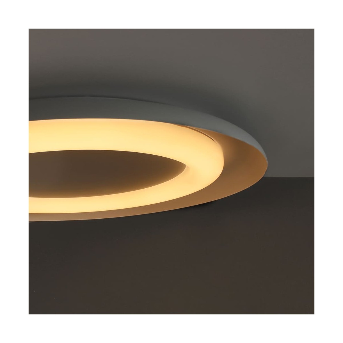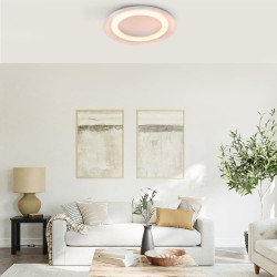Ceiling flush lamp with warm LED lighting Jara. Circular ceiling lamp made of white aluminium and polycarbonate diffuser in the shape of a ring on the inside. The light is projected uniformly through the ring diffuser to illuminate rooms such as living rooms or kitchens. The ceiling light has integrated LED lighting in a warm tone, with a power of 48W and an intensity of 2650 lumens.