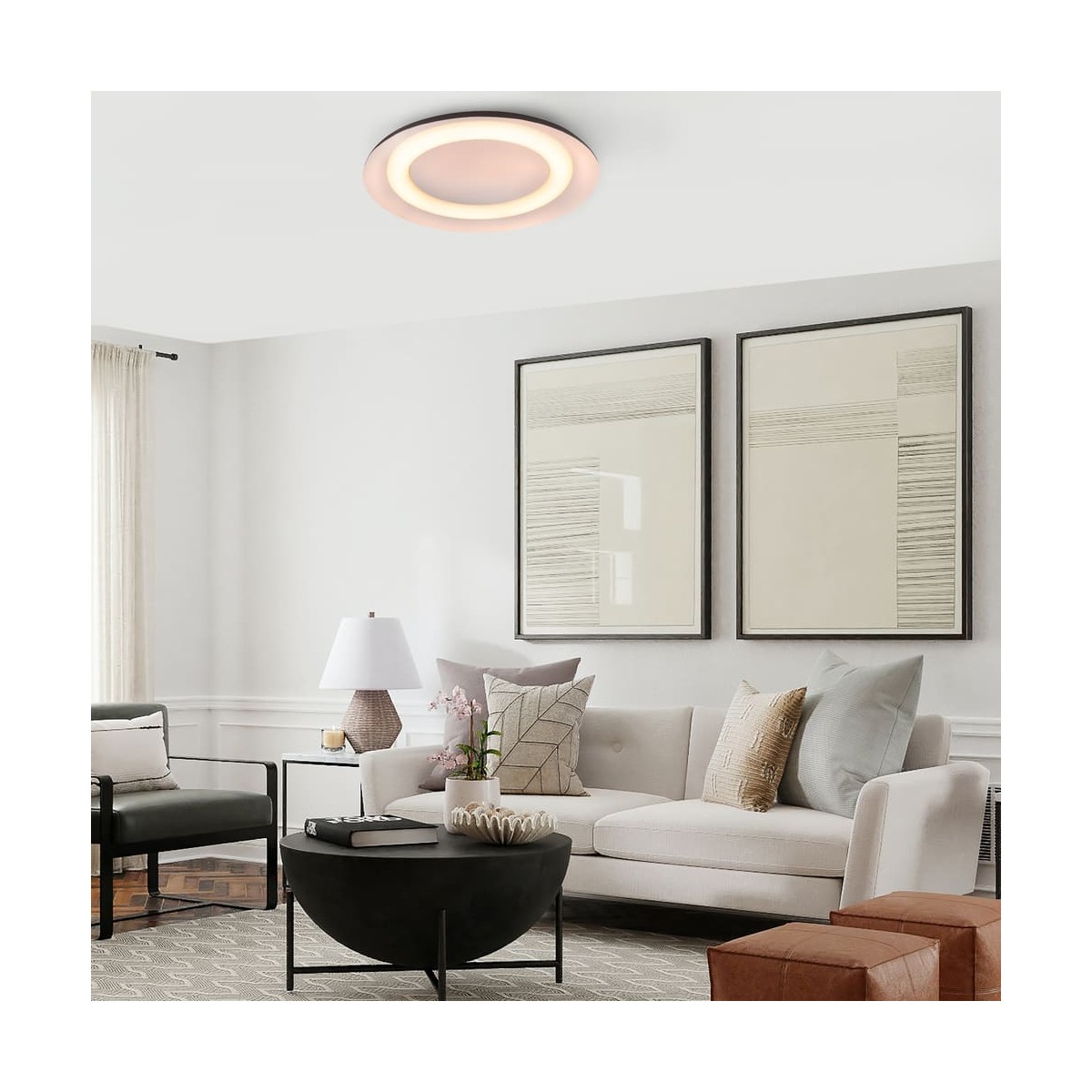 Plafonnier Jara 48W LED. Plafonnier circulaire avec un diffuseur annulaire, parfait pour être installé comme source de lumière principale dans une pièce. Fabriqué en aluminium, avec l'intérieur en blanc et l'extérieur en noir. Éclairage LED dans un ton chaud (3000ºK) fournissant une lumière confortable dans la pièce que vous décidez d'éclairer.