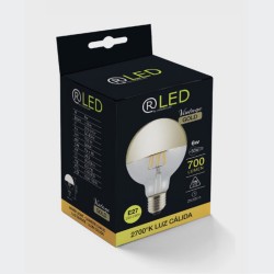 Ampoule LED de 95 mm de diamètre avec effet miroir demi-dôme en or. Ampoule à filament LED à effet vintage, avec une lumière chaude de 2700K, une puissance de 6w et 700 lumens.