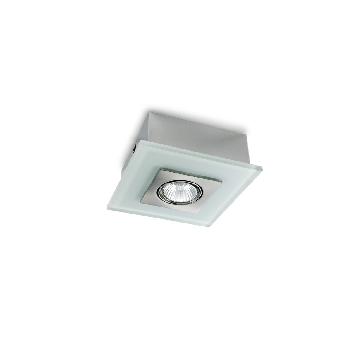 Plafonnier en saillie avec spot réglable. Structure en aluminium avec finition nickel et plaque décorative en verre flotté blanc. Comprend un support de lampe GU5.3.