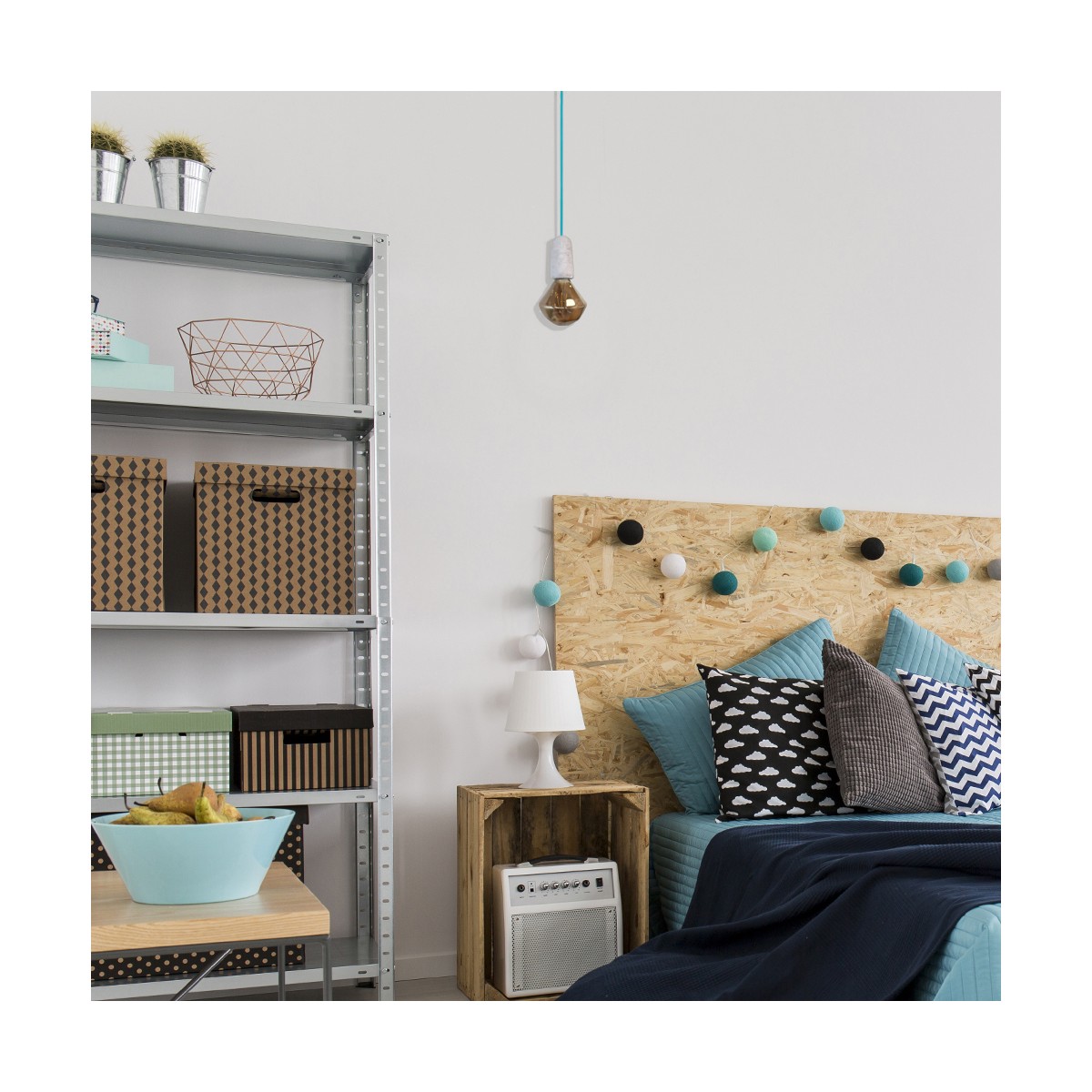 Finition ciment et câble textile bleu (ampoule non incluse).