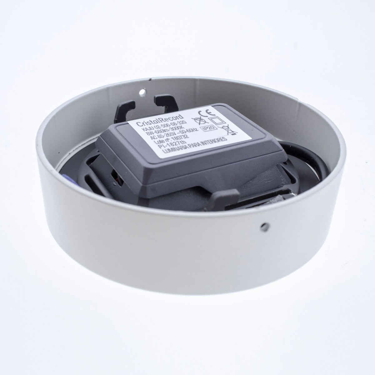 Spot LED de surface avec une lumière chaude de 8W, 680lm. Structure en aluminium laqué blanc d'un diamètre de 90 mm.