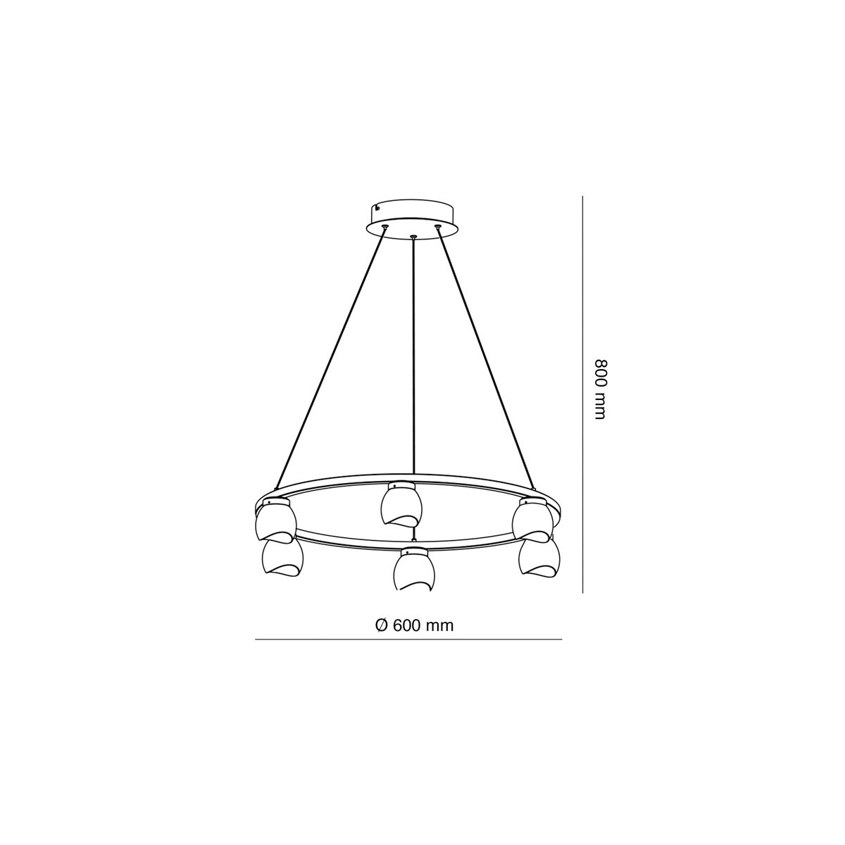 Suspension à structure ronde, suspendu par trois cordelette noirs. Chacun de ses 6 abat-jour en verre est équipé d'une Led COB 5w intégrée avec une lumière chaude à 3000K.