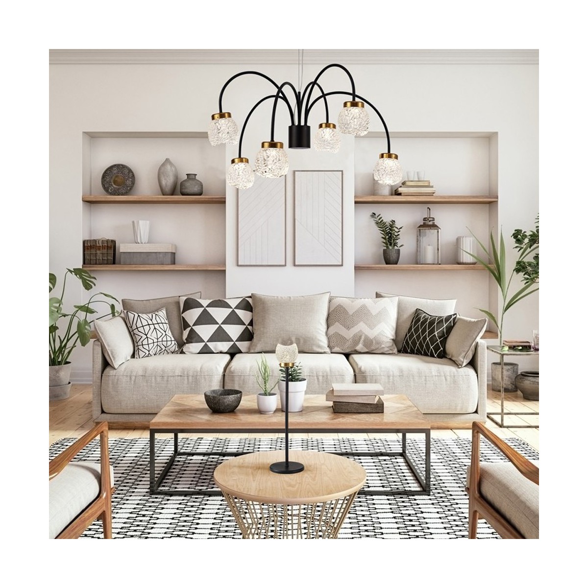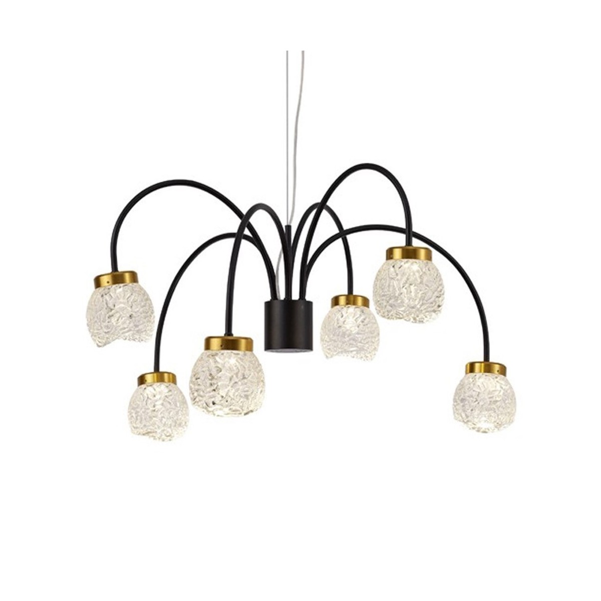 Suspension à structure inégale, suspendu par 6 cordelette noirs. Chacun de ses 6 abat-jour en verre est équipé d'une Led COB 5w intégrée avec une lumière chaude à 3000K.