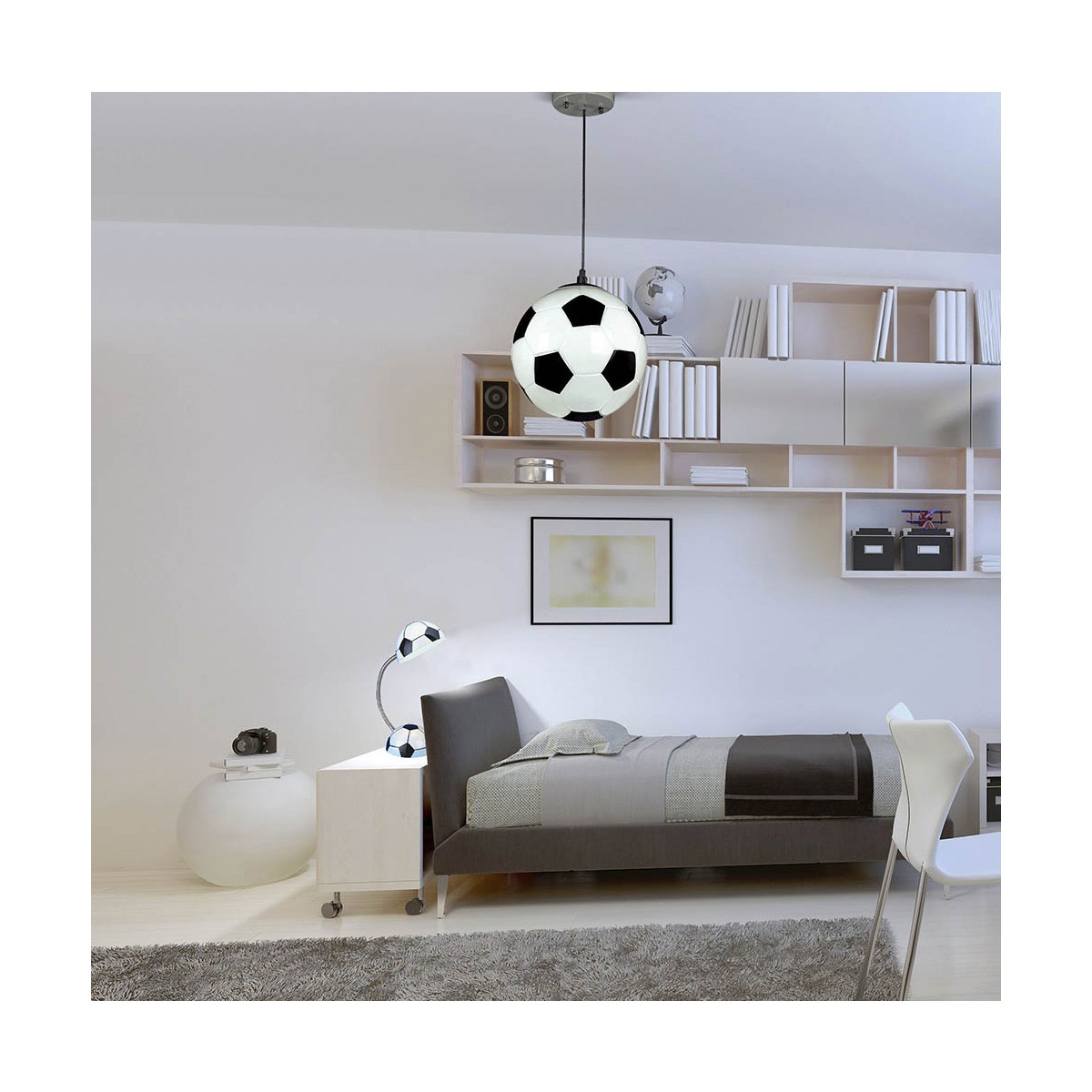 Suspension pour enfants avec design footballistique et abat-jour en verre. Apporte un style sportif dans les chambres d'enfants et les salles de jeux.